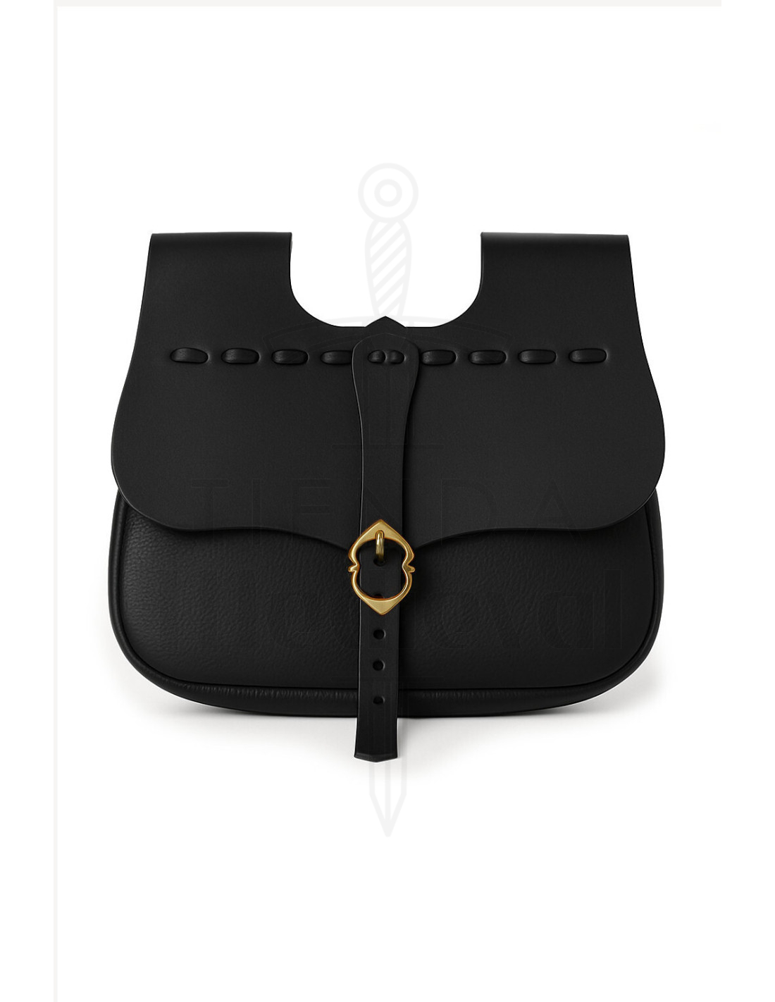 Con un design ispirato alle borse utilizzate durante il Medioevo, questa marsupio non solo riflette un carattere storico, ma offre anche la praticità di essere fissata comodamente a cinture fino a 5 cm di larghezza grazie alle sue due fibbie. La sua finitura in pelle nera, di texture morbida ed elegante, garantisce durata e un look sofisticato ad ogni utilizzo. La patta curva decorata con cuciture e la chiusura con fibbia metallica dorata aggiungono un tocco distintivo che combina autenticità e stile moderno.