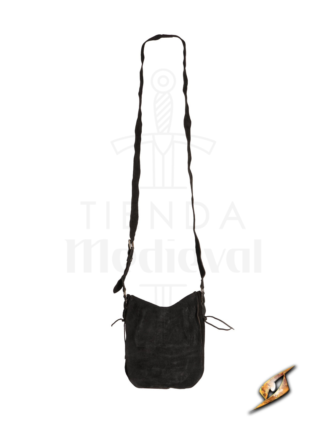 Disponibile in nero, si abbina a ogni tipo di abbigliamento, dalle tuniche ai look casual, e si integra perfettamente in ambienti storici o fantasy. La superficie in pelle scamosciata, con una finitura morbida e leggermente lucida, è resistente e durevole, garantendo che la tua borsa invecchi con carattere e stile proprio.