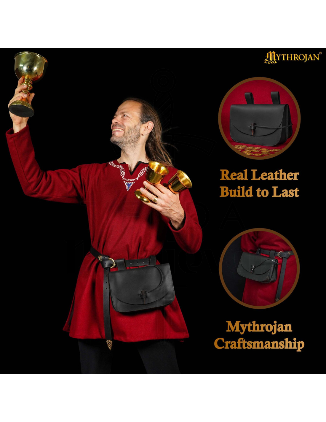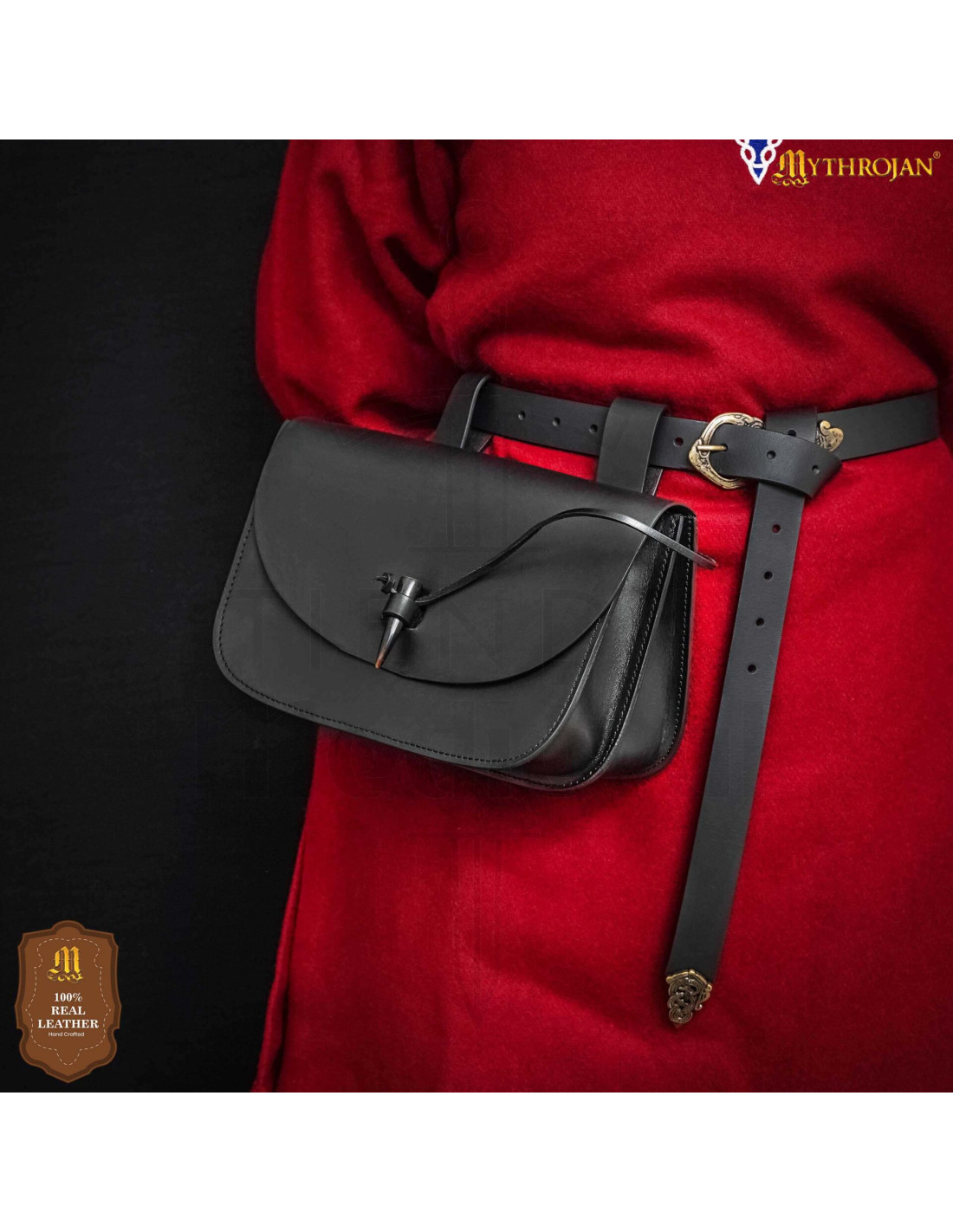 La finitura nera liscia, con cuciture visibili che rinforzano i bordi, conferisce sobrietà e resistenza apparente, ideale da abbinare a abbigliamenti di ambientazione medievale, ricostruzioni storiche o look urbani ispirati a epoche passate. Il suo design semplice evita decorazioni superflue, favorendo versatilità e una presenza che aggiunge carattere senza appesantire.