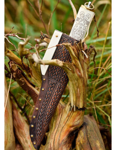 Ogni Small Viking Seax Knife viene fornito con un fodero in pelle, accuratamente lavorato con rivetti in ottone e decorato con due anelli a forma di serpente attorcigliato, a simboleggiare il coraggio e la protezione che caratterizzavano i Vichinghi.