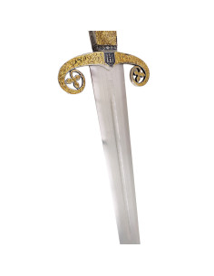 Il pugno o manico della spada è bagnato d'argento su dorature scolpite sui bordi e sui piani. La sua maglia cilindrica, a mandorla e sovrapposta in stile gotico gli conferisce un tocco unico e distintivo.