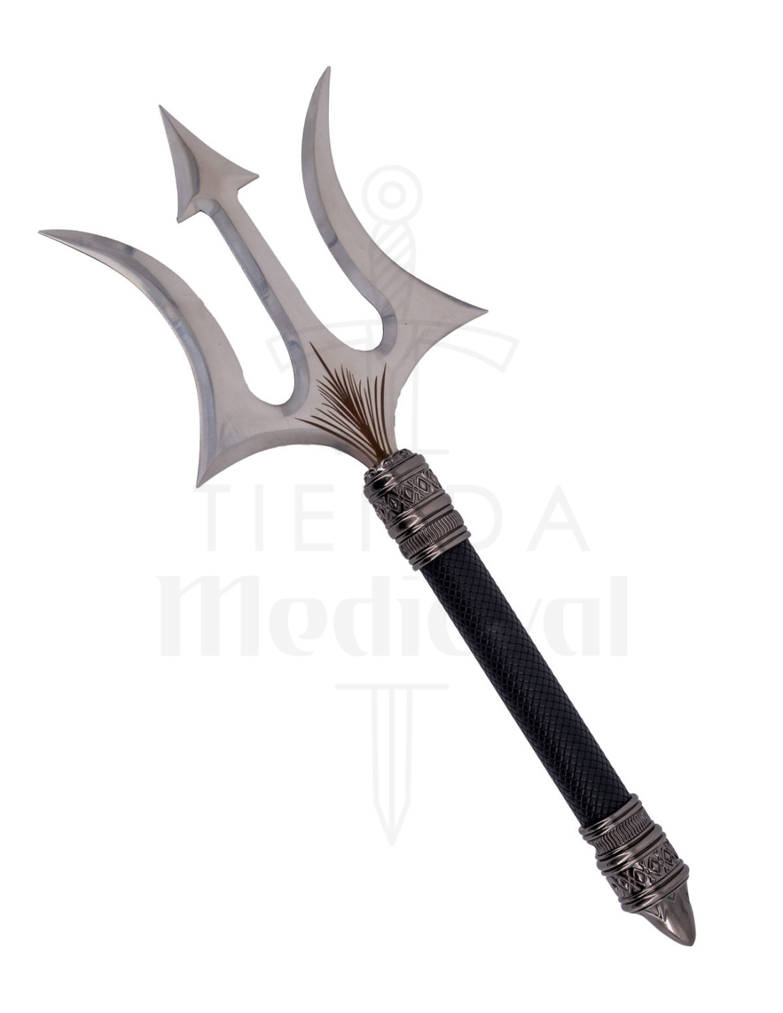 Il Tridente cerimoniale corto con impugnatura legata combina un aspetto metallico lucido con un manico progettato per sentirsi saldo in mano, offrendo una presenza imponente senza rinunciare al comfort. La sua punta centrale, terminata a forma di freccia, insieme alle due punte laterali curve, crea una silhouette distintiva che si fa notare in qualsiasi vetrina o angolo tematico.