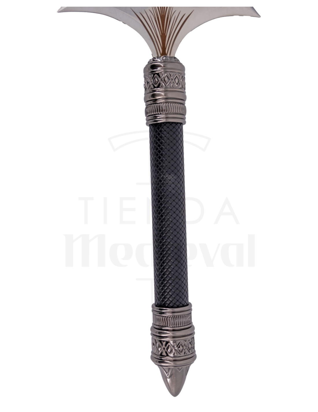 La finitura brillante della punta e i motivi incisi alla base aggiungono profondità visiva, riflettendo la luce con un effetto elegante che esalta ogni dettaglio. L'impugnatura in similpelle con texture intrecciata, oltre a conferire un'aria sobria, facilita una presa stabile, ideale per un'esposizione maneggevole o per chi ama montare e mostrare pezzi con un tocco sicuro.