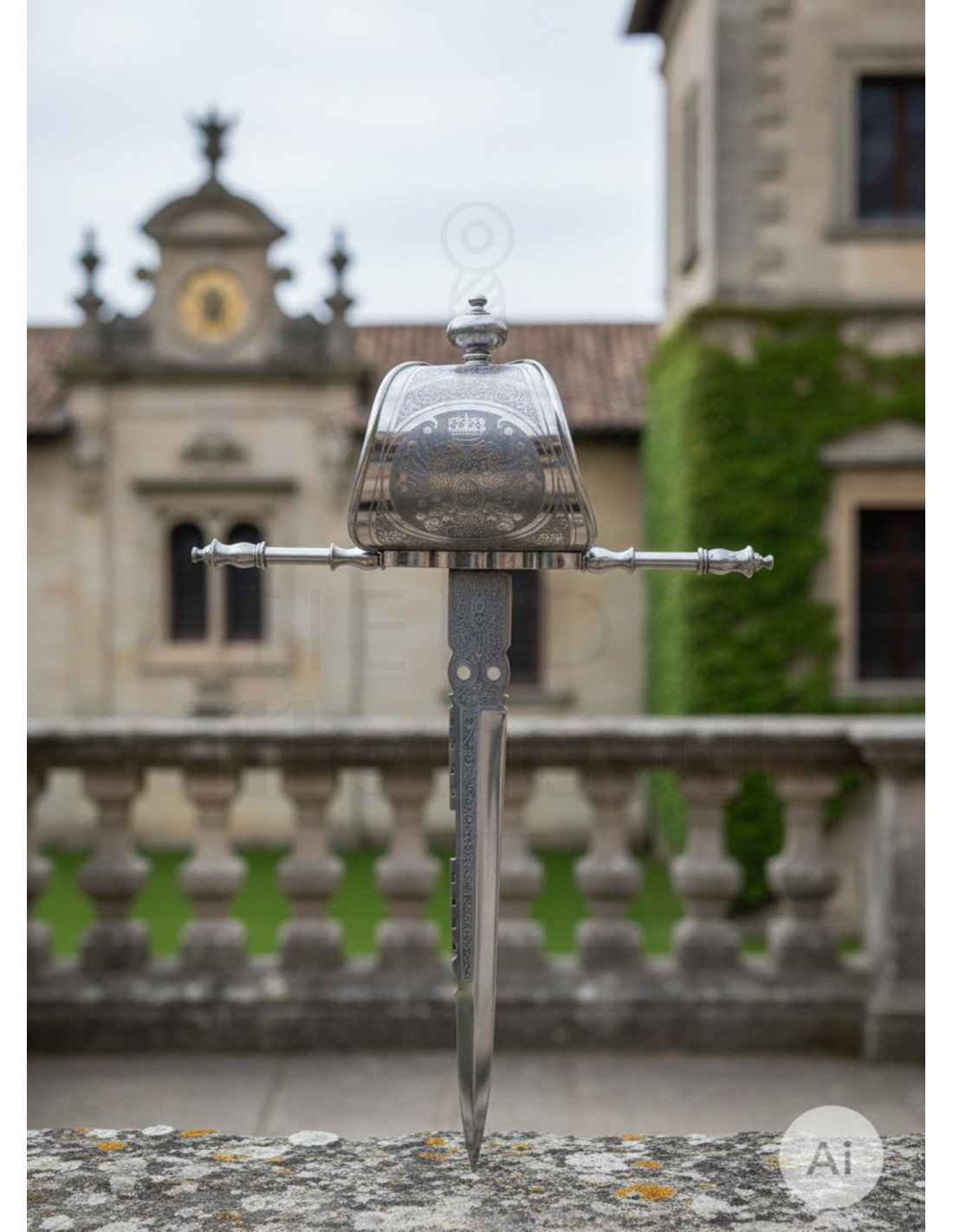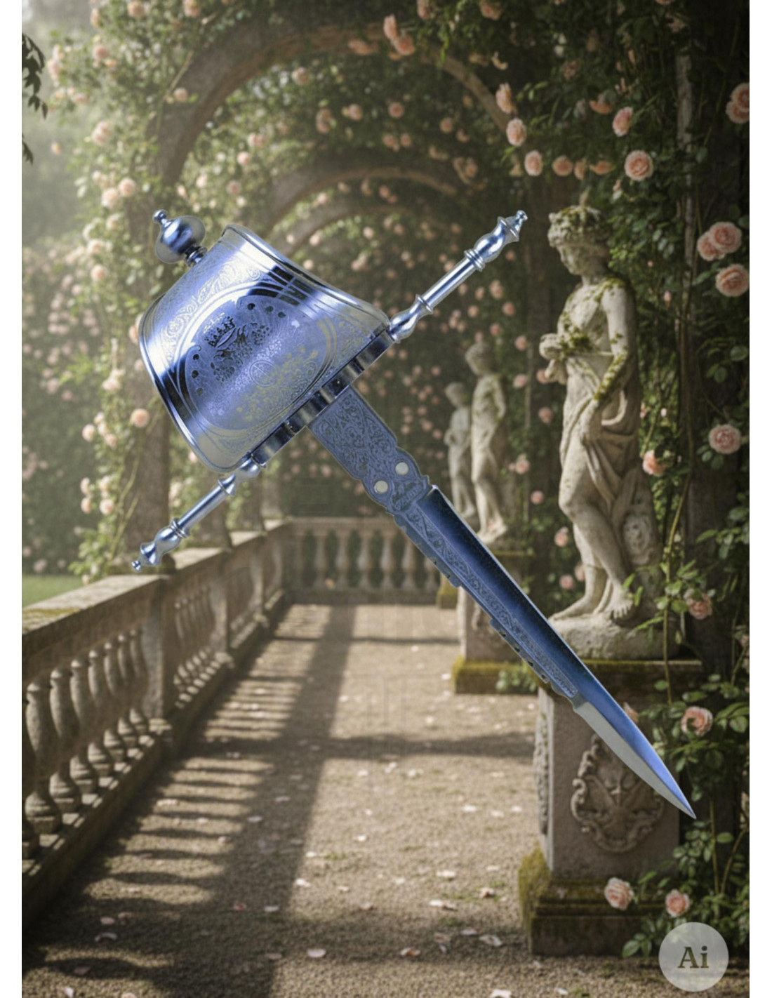 Scopri il Pugnale della mano sinistra con fodero, un pezzo eccezionale per i collezionisti! Questo pugnale è stato realizzato artigianalmente a Toledo, in Spagna, con meticolosa attenzione ai dettagli. La lama e la ciotola in acciaio inciso gli conferiscono un aspetto unico ed elegante.