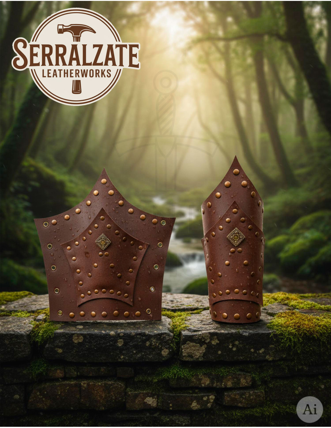 Progettati per offrire protezione e stile senza ostacolare le tue azioni, le curve strategiche seguono la linea naturale dell'avambraccio, creando una silhouette dinamica che accompagna ogni gesto. Le borchie in ottone antico e le placche a forma di rombo conferiscono un aspetto deciso, oltre a rinforzare le zone più esposte.