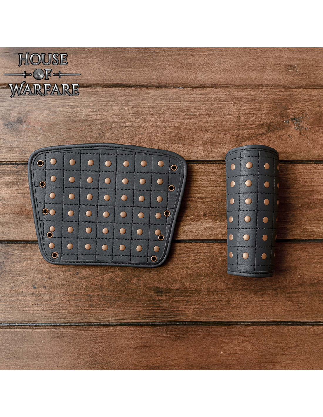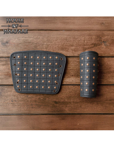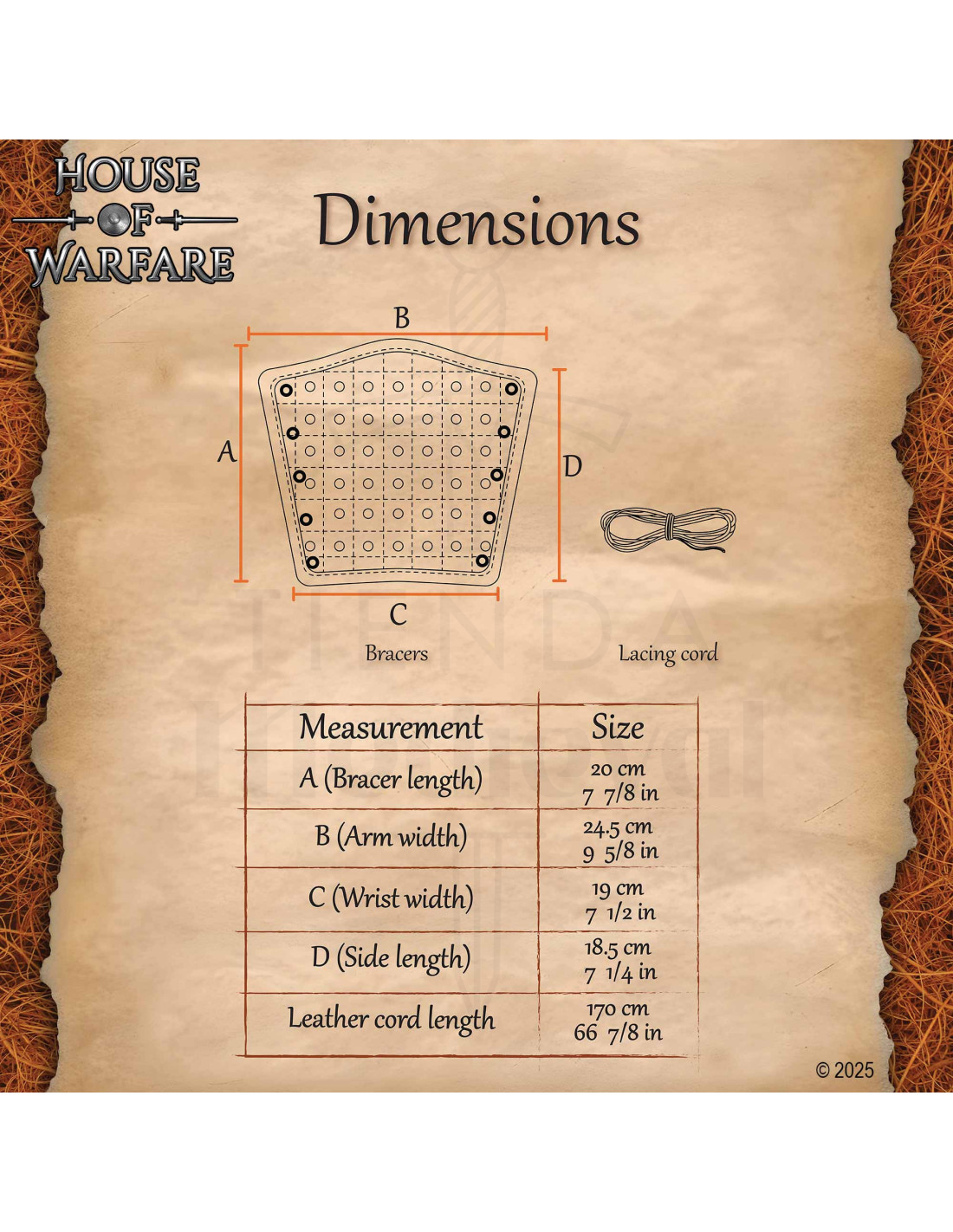 Dimentica il fastidio durante le lunghe giornate: l'interno imbottito e le cuciture rinforzate garantiscono comfort continuo e resistenza all'uso intensivo. Il cordino di regolazione in pelle consente di personalizzare facilmente la chiusura, adattandosi a diverse misure di avambraccio e mantenendo il pezzo sicuro in combattimenti LARP, fiere rinascimentali o spettacoli dal vivo.