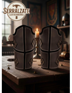 Realizzati in vera pelle marrone scuro, presentano una finitura liscia e un lavoro artigianale che parla da solo, con cuciture bianche che tracciano un motivo curato e rinforzano le aree più esposte, offrendo una sensazione di resistenza e carattere fin dal primo gesto. La loro costruzione in più pezzi si adatta al contorno dell'avambraccio, garantendo una vestibilità sicura senza limitare i movimenti, ideale per ricreazioni storiche, cosplay o eventi tematici dove la mobilità e l'aspetto contano allo stesso modo.