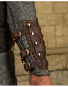 Il design marrone scuro, con cuciture a contrasto e rivetti scuri, trasmette carattere e resistenza, integrandosi facilmente in abiti rustici o urbani. Coprendo una parte significativa dell'avambraccio e del polso, offre una sensazione di sicurezza, senza limitare il movimento grazie alle sue cinghie regolabili che assicurano che rimanga fissato dove deve.