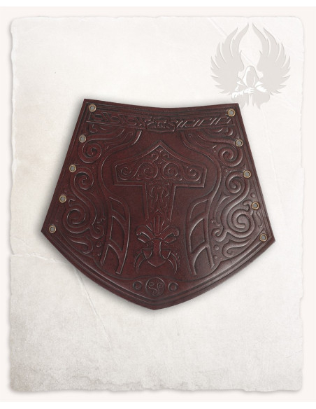 I motivi in rilievo, con un casco a corna e motivi curvilinei e geometrici, evocano l'estetica nordica con autenticità, mentre il simbolo circolare con tre spirali intrecciate aggiunge un cenno mistico che cattura l'attenzione. Ogni dettaglio è stato progettato per complementare costumi vichinghi e look ispirati alla mitologia, senza perdere eleganza.