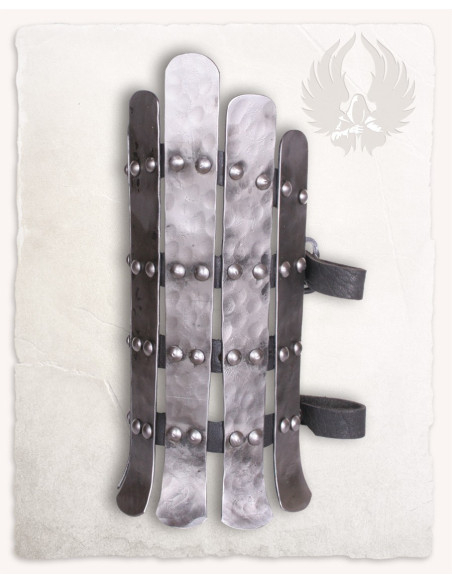 Questa coppia di bracciali è costruita con strisce di acciaio ribattute su rinforzi in pelle, e si adatta mediante cinghie con fibbie in ferro battuto, per permetterti di regolare la protezione su misura senza complicazioni. La finitura martellata conferisce un aspetto rustico e lavorato, mentre i bordi più scuri contrastano con le strisce centrali più chiare, creando un design che appare autentico e resistente al tempo stesso. Le parti attorno al polso si curvano verso l'esterno, permettendo movimenti agili della mano, senza sacrificare la copertura dell'avambraccio.