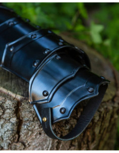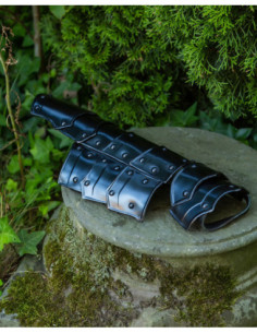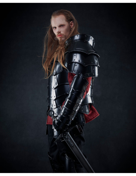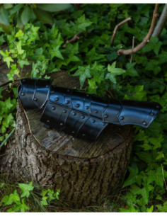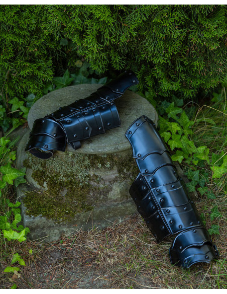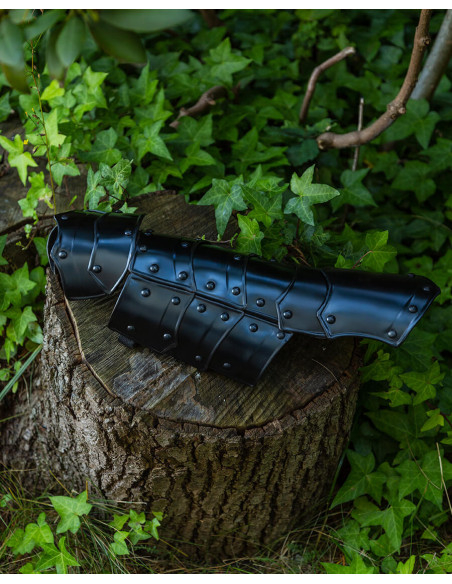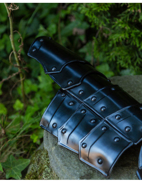 Visivamente, i pezzi mostrano un nero profondo e una lucentezza controllata che risaltano i contorni segmentati, ideali sia per ambientazioni storiche che per scenari di combattimento pratico. Inoltre, la loro costruzione consente di adattarli in base alle necessità, essendo adatti a proteggere avambracci o polpacci a seconda della regolazione e della posizione.