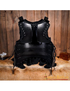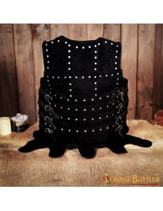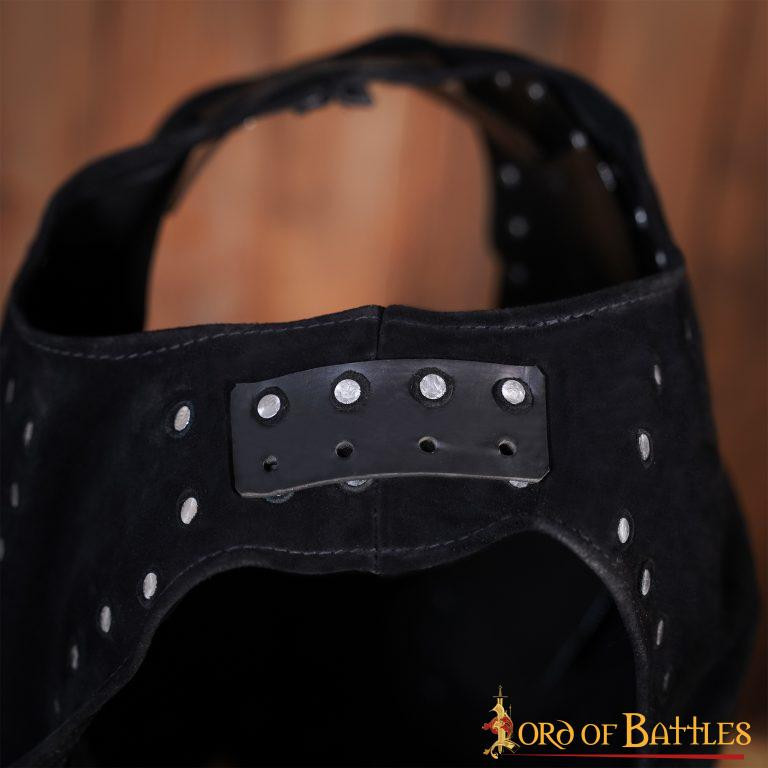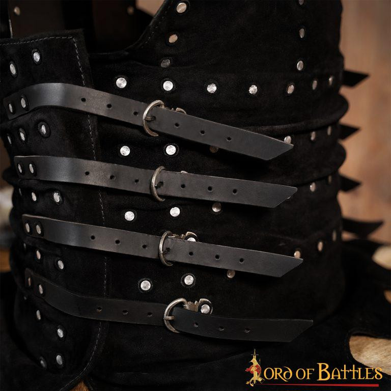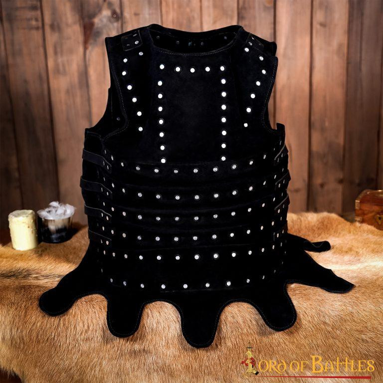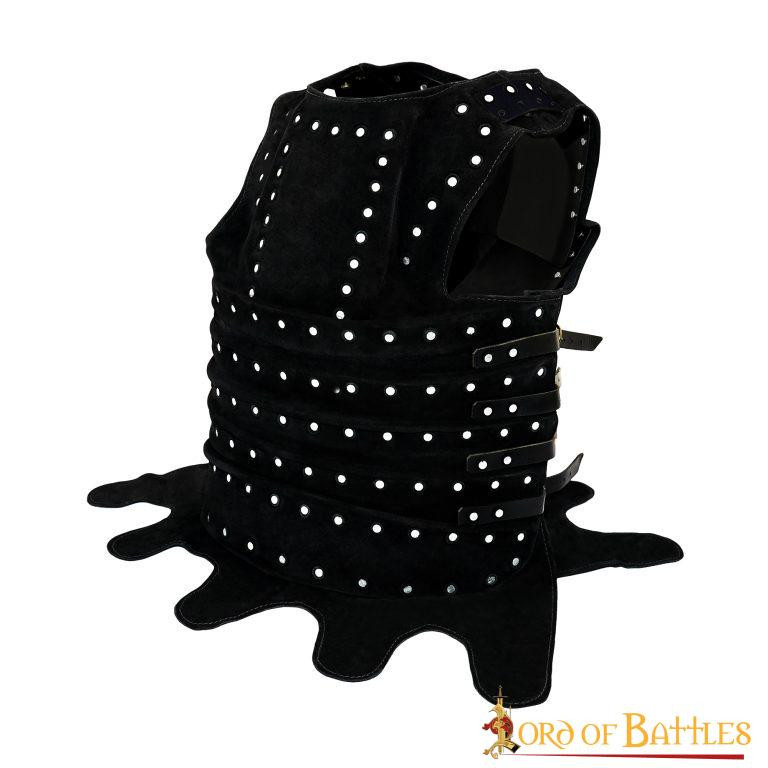Brigantino medievale modello Kusnacht S. XIV. Il nostro brigantino è realizzato con lastre di ACCIAIO calibro 20, accuratamente rivettate alla superficie interna di ROBUSTA VERA PELLE SCAMOSCIATA, la cui forma è direttamente ispirata alla rappresentazione originale del XIV secolo, la Baviera. È facilmente adattabile alla forma del tuo corpo, grazie alle sue diverse misure DISPONIBILI e alle cinghie in pelle accuratamente posizionate sui lati che ti permettono di regolarlo, a seconda del tipo di gambeson che stai utilizzando. Apprezzerai la robusta pelle sulla spalla che ti consente di attaccare direttamente le spalline al tuo brigantino nel modo più efficiente.