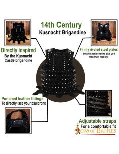 Questo bellissimo brigantino del XIV secolo è direttamente ispirato al famoso brigantino Kusnacht trovato in un castello in Svizzera. È una delle Brigandine più conosciute del XIV secolo e anche una delle più popolari oggi, sia nei tornei e nei campi di battaglia medievali, sia nei Behourd e nelle giostre.