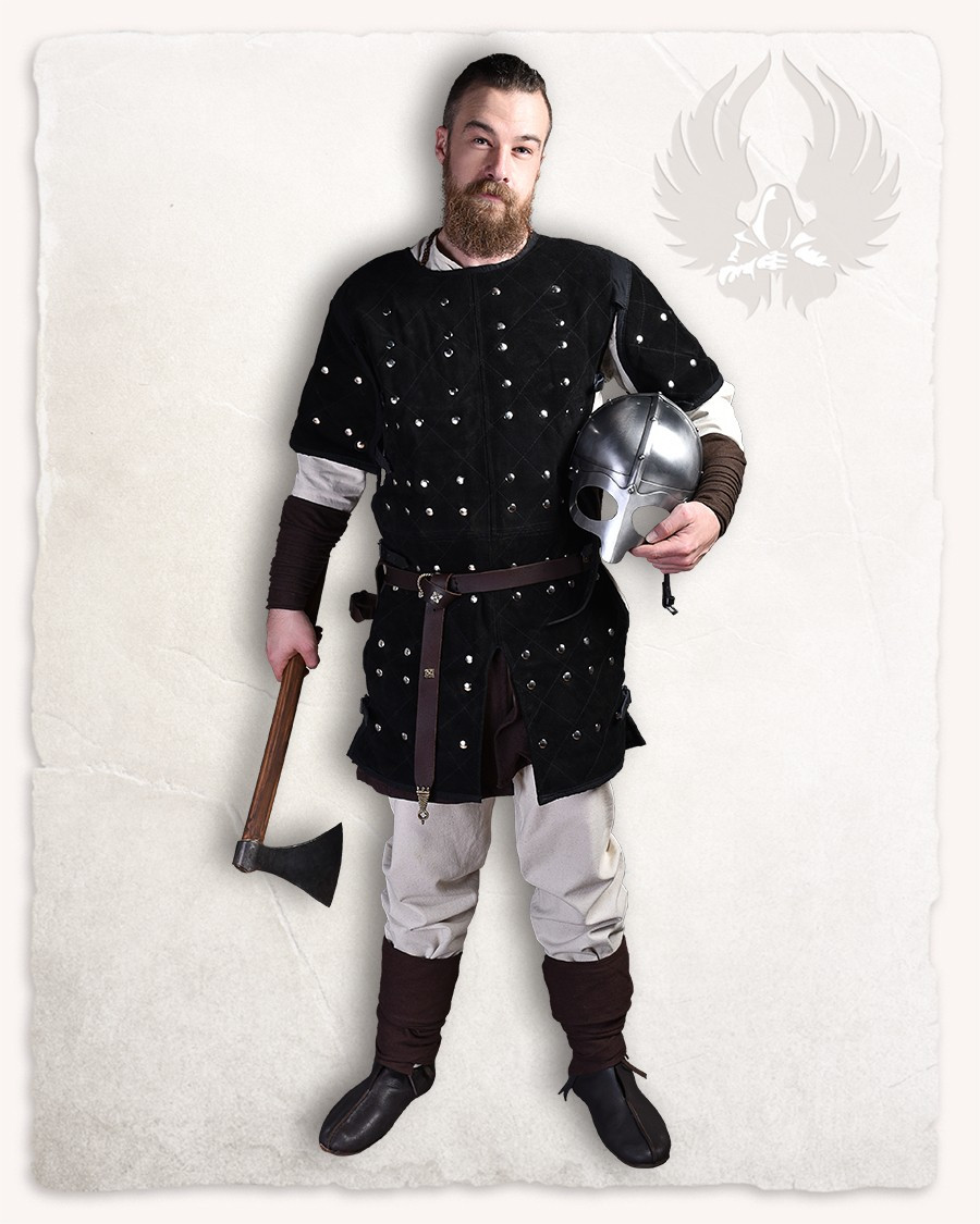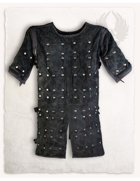 La Brigantina medieval modello Joshua, cuoio nero offre questo equilibrio perfetto tra estetica e funzionalità. L'esterno in suede offre una superficie morbida e una finitura scura elegante, che invecchia con carattere e facilita movimenti naturali senza rinunciare allo stile. All'interno, piastre metalliche attentamente rivettate fungevano da struttura interna discreta, fornendo una sensazione di sicurezza e fermezza senza rigidità scomoda, mentre la fodera in cotone protegge la pelle e mantiene l'indumento piacevole durante lunghe giornate.