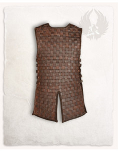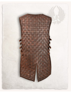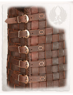 Le cinghie laterali con anelli e fibbie garantiscono una vestibilità personalizzabile, in modo che la corazza rimanga adatta senza limitarti. I rinforzi sulle spalle, realizzati con un pezzo superiore in pelle, aggiungono protezione nella zona più esposta, equilibrando esteticamente l'insieme.