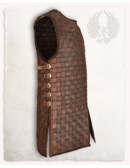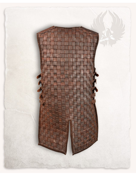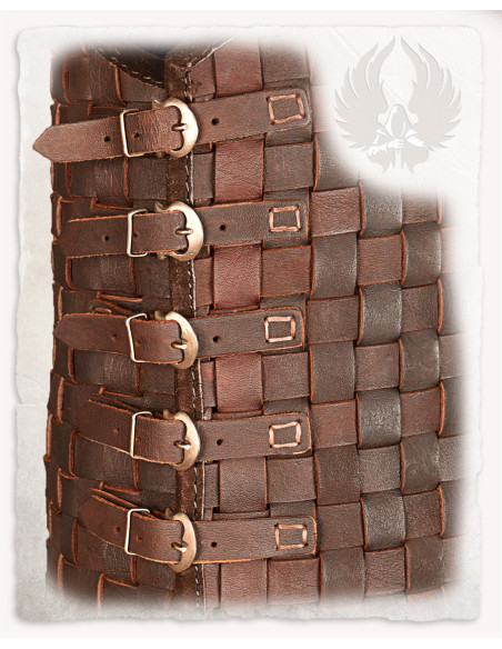 La tessitura di strisce di pelle crea un pattern quadrato con una finitura marrone scuro che trasmette carattere rustico e cura artigianale. Questa struttura intrecciata non solo appare bene, ma offre anche flessibilità dove ne hai bisogno, permettendo al petto di adattarsi ai tuoi movimenti e mantenere una silhouette coerente e sicura.