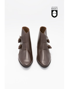 Disponibili in un'elegante tonalità marrone scuro, queste scarpe includono anche suole per maggiore protezione e comfort. Completa il tuo outfit medievale con queste scarpe e preparati a vivere un'esperienza unica ad ogni passo!