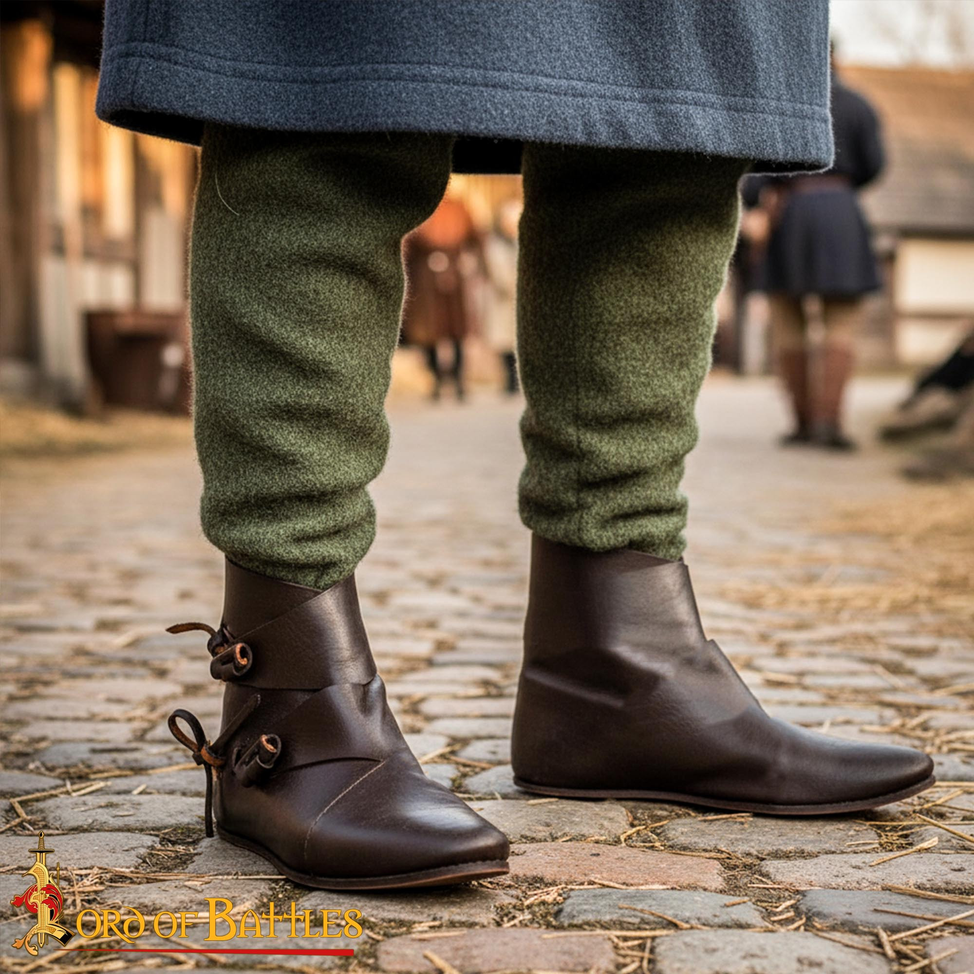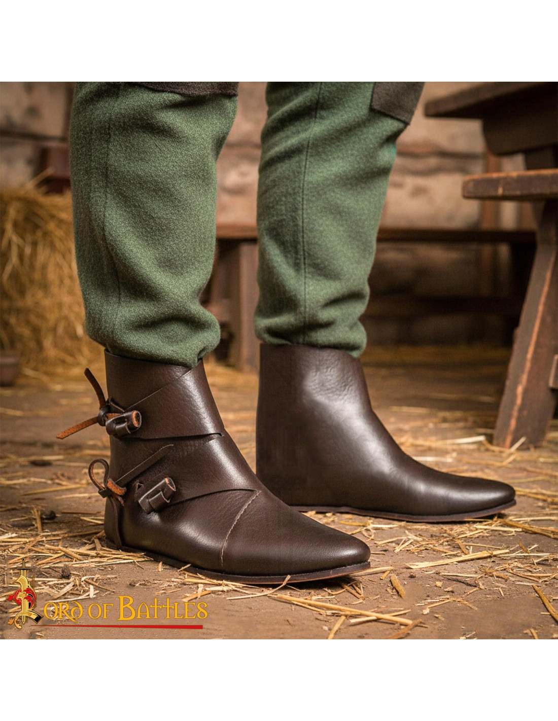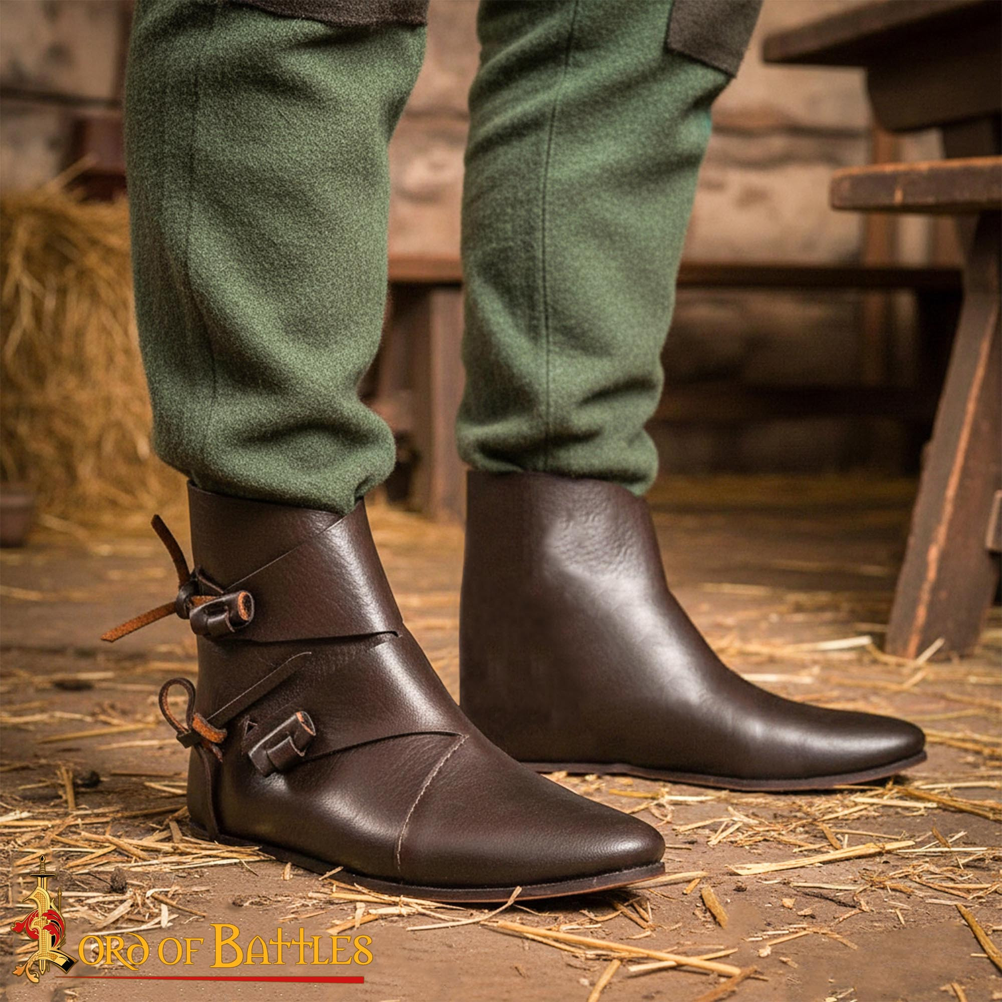 Gli Stivaletti vichinghi modello Jorvik in cuoio marrone sono realizzati a mano in vera pelle, il che si traduce in una comodità che migliora con l'uso, un adattamento che si conforma alla forma del piede e un'estetica calda e nobile. La chiusura con due bottoni e nastri arrotolati offre una vestibilità salda e tradizionale, facilmente regolabile per mantenere la calzata stabile durante lunghe giornate su terreni morbidi o in scenari di ricreazione storica.