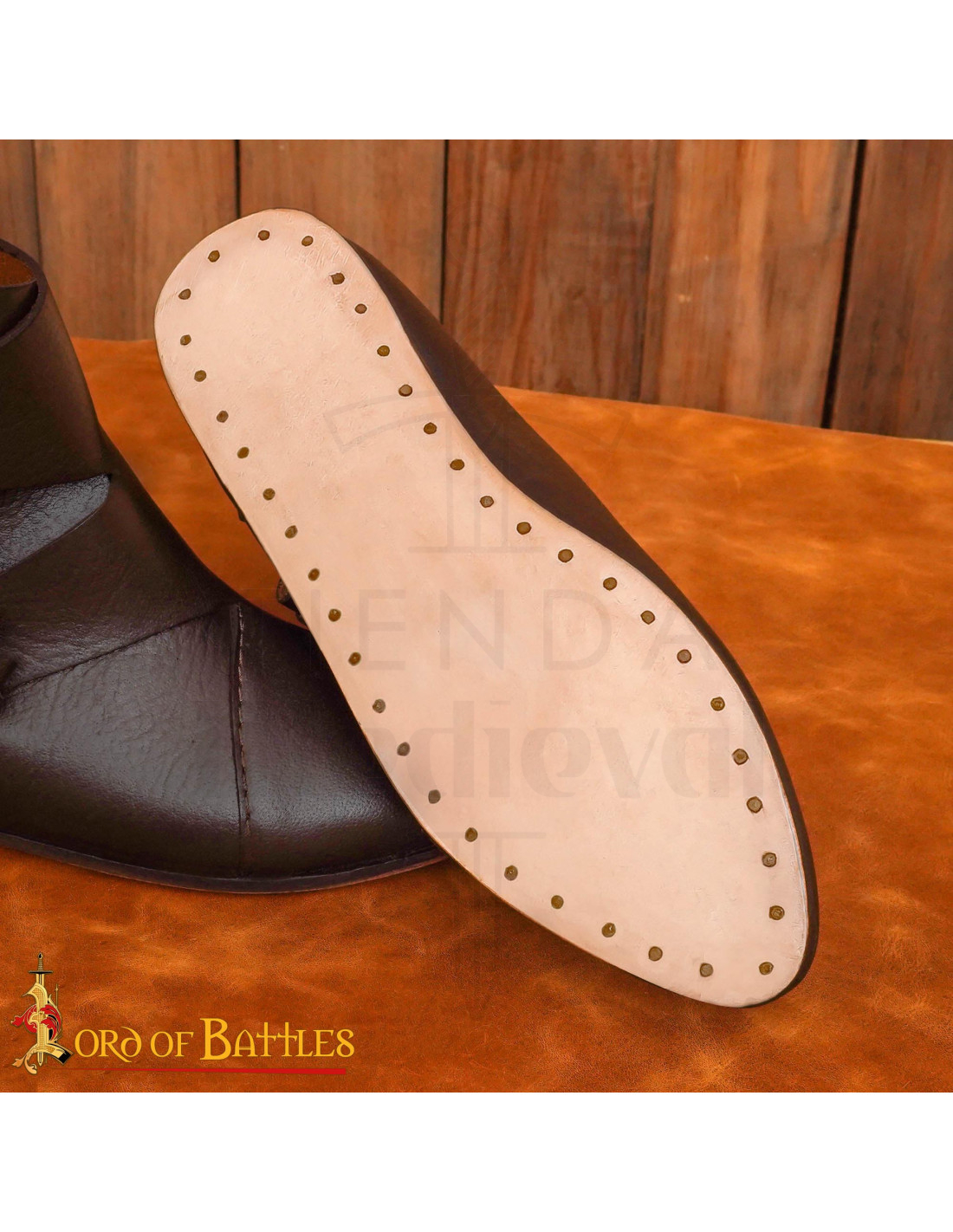 La sua altezza bassa fino alla caviglia e la punta leggermente affusolata consentono libertà di movimento, ideale per spostamenti agili senza rinunciare all'aspetto storico. L'interno in tono chiaro e la finitura senza artifici trasmettono autenticità visiva, mentre la suola in cuoio piatto offre quella sensazione di contatto naturale con il terreno, perfetta per sentieri di terra, boschi e ambienti fiere medievali.