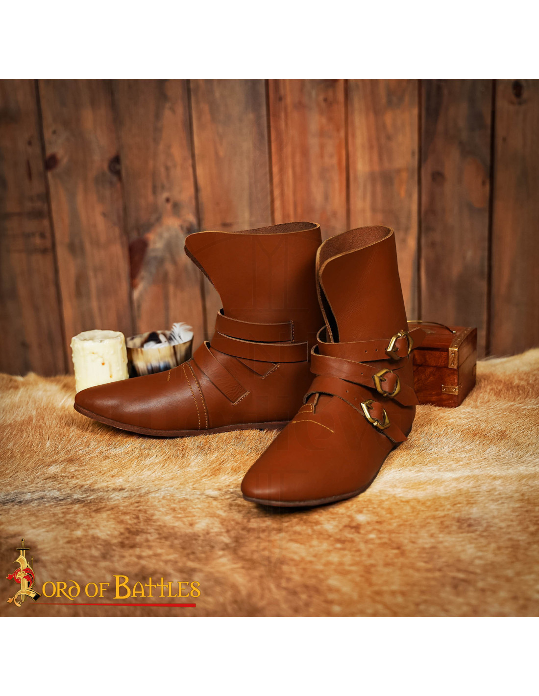 Questi Stivaletti medievali in cuoio marrone del XV secolo con 3 fibbie: Il nome ufficiale del prodotto uniscono l'aspetto storico alla comodità contemporanea, pensati per chi apprezza autenticità e uso quotidiano. La pelle liscia e il gambale medio abbracciano la caviglia offrendo una vestibilità aderente che esalta la silhouette del piede, mentre le tre cinghie regolabili con fibbie metalliche dorate a forma esagonale permettono di adattare la tenuta a seconda che si indossino collant o leggings.
