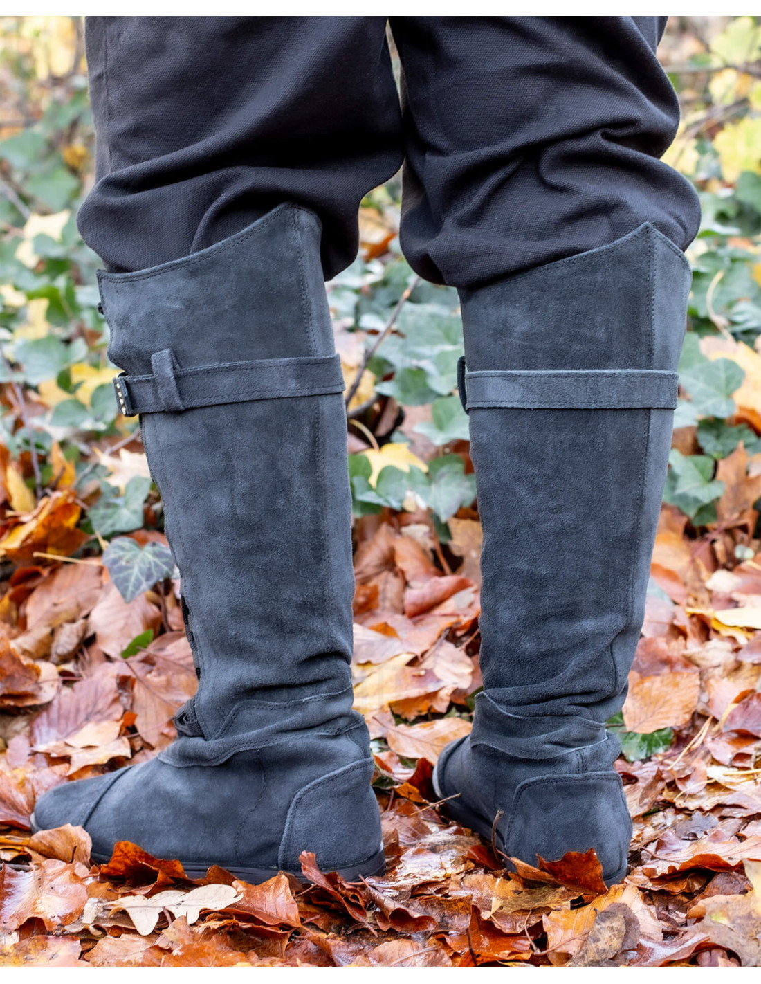 Questi stivali medievali con lacci modello Taras, colore nero offrono una vestibilità migliorata che segue il movimento del piede, grazie a un design che abbraccia senza stringere e consente di regolare il gambale fino alla zona appena sotto il ginocchio. La chiusura con lacci verticali e la cinghia superiore con fibbia metallica non solo apportano carattere visivo, ma consentono anche di personalizzare la vestibilità per maggior sicurezza e stile.