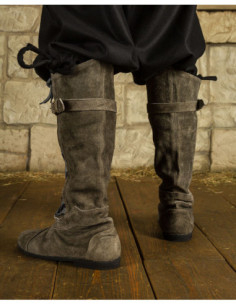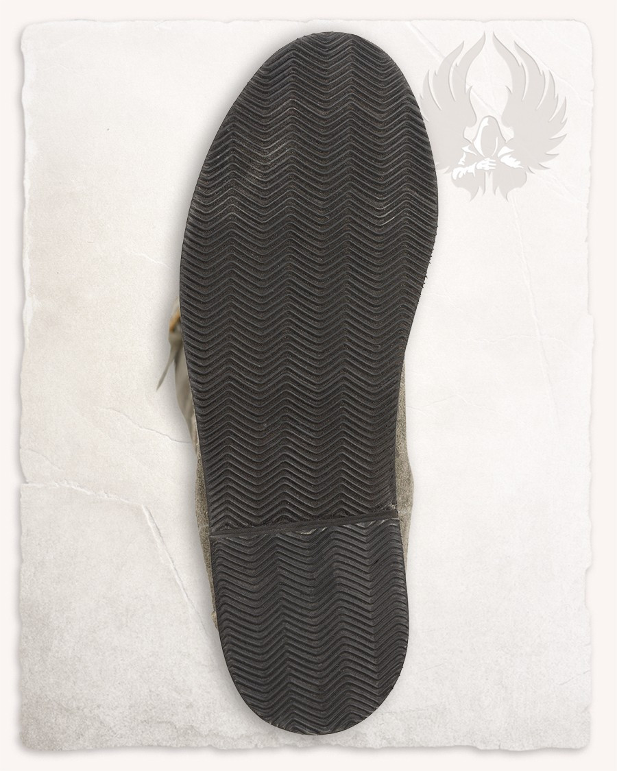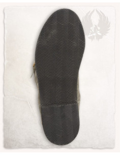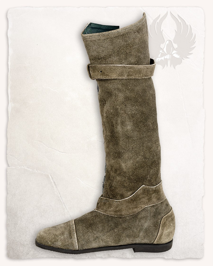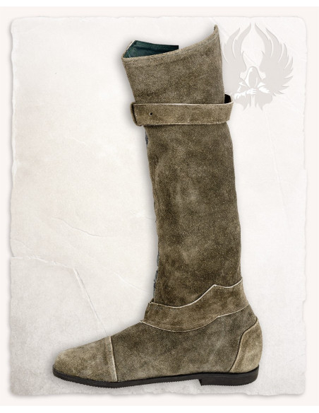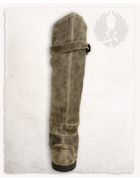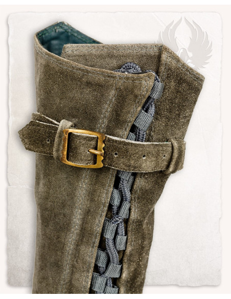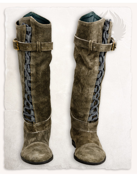 Nota che, trattandosi di pezzi artigianali, ogni paio presenta piccole variazioni nel tono e nella finitura; nell'immagine si possono notare in una sfumatura marrone-grigiastro, mentre la versione in colore verde oliva mantiene la stessa texture e carattere. Se stai cercando dove acquistare Stivali medievali con lacci modello Taras, color verde oliva con finitura autentica e vestibilità migliorata, questo modello risponde a tale esigenza.