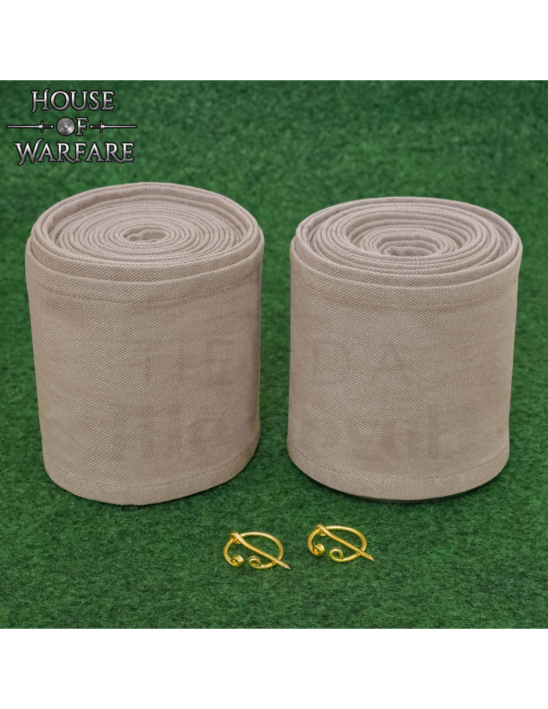 Il set include due pezzi per entrambe le gambe e chiusure metalliche in ottone che facilitano la regolazione, assicurando che le cinghie rimangano ferme durante l'attività. Visivamente, i pezzi si presentano arrotolati in tonalità beige naturale con una texture spessa e resistente che trasmette robustezza e autenticità, mentre le fibbie dorate, con una barra centrale che si incastra nel cerchio, aggiungono il tocco storico che esalta qualsiasi costume.