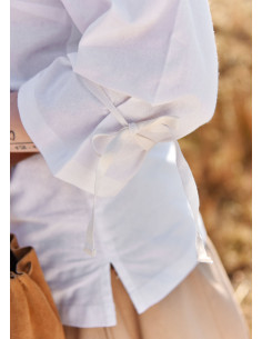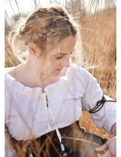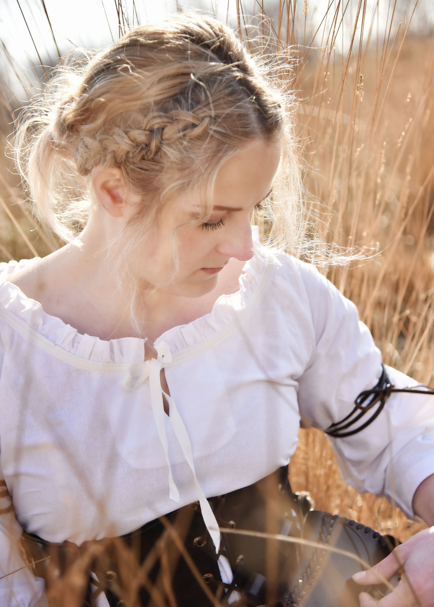 Scopri l'eleganza e lo stile della camicetta medievale da donna modello Birga in bianco. Realizzata in cotone leggero, questa camicetta è sinonimo di praticità e comfort. Il suo design accuratamente realizzato si ispira alla moda medievale, rendendolo un capo unico e molto speciale.