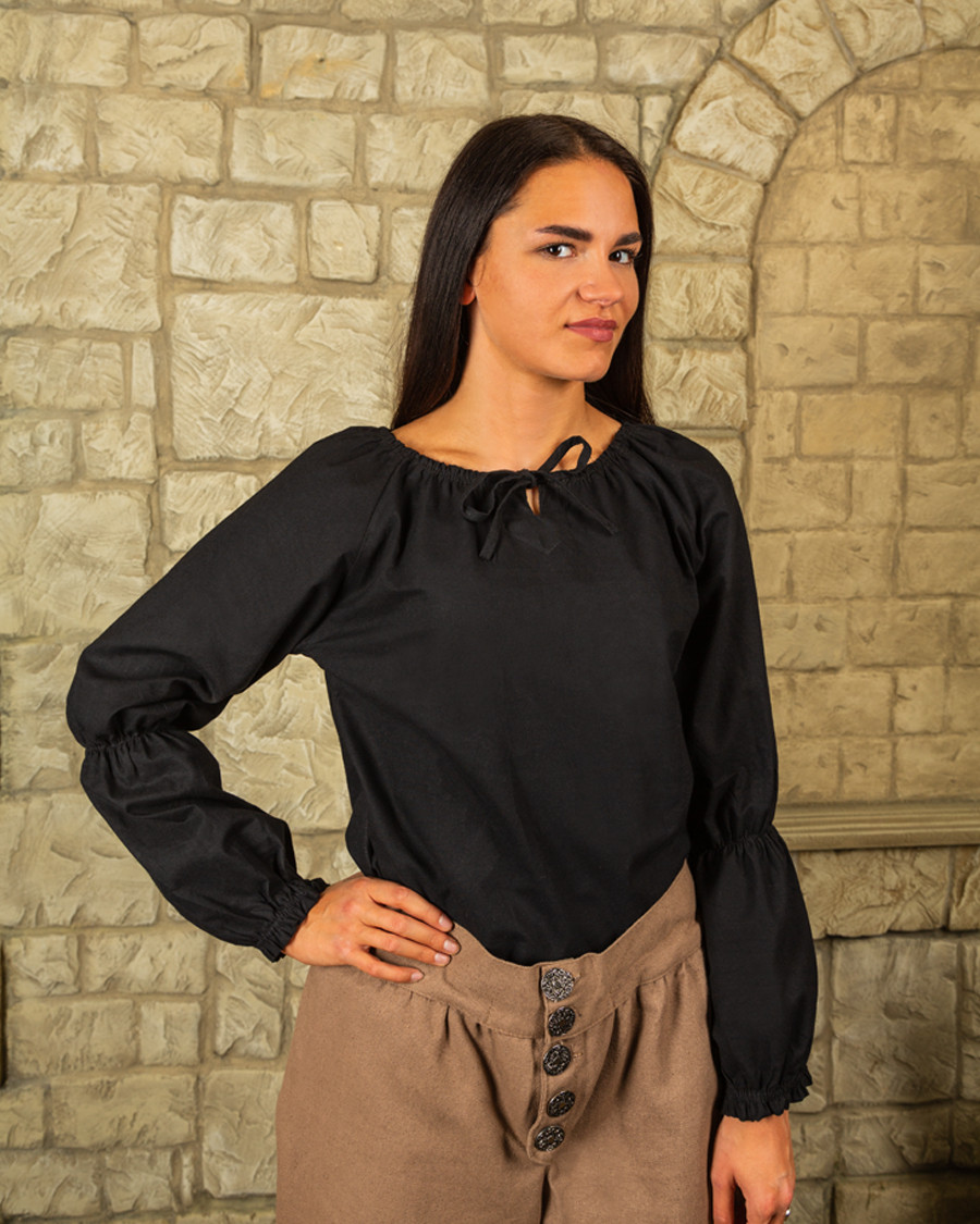 Questa blusa nera intensa è disegnata con un laccio frontale che dona un tocco elegante e femminile al tuo abbigliamento medievale. Inoltre, la sua fabbricazione in tessuto canvas ne garantisce la durata e la resistenza, permettendoti di goderti a lungo questo capo.