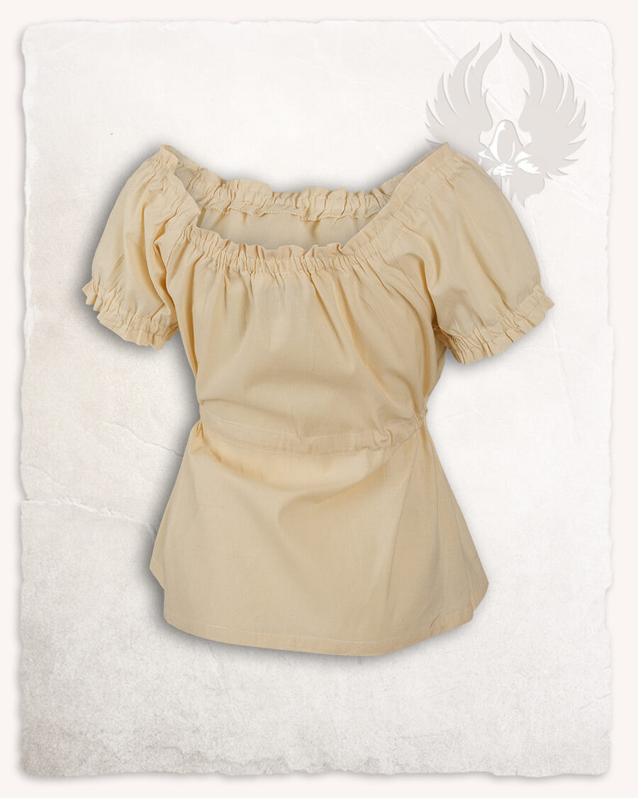 Vi presentiamo la Camicetta Kalina, un indumento in cotone leggero color crema che si adatta perfettamente ai costumi di una cameriera di taverna o di un avventuroso pirata. La blusa ha una scollatura elastica che permette di indossarla in vari modi: puoi portare una scollatura -Carmen- sulle spalle o portare le maniche sopra le spalle per creare uno scollo tondo. Le maniche a sbuffo sono comode grazie all'elastico che le regola al fondo.