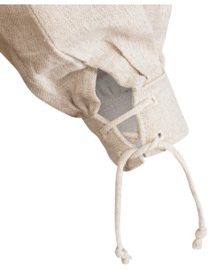 Il colletto a revers, regolabile con i lacci, insieme alle maniche lunghe e ai polsini anch'essi regolabili, ti donano un tocco di autenticità e funzionalità. La texture naturale del lino color crema, con un finish in tonalità beige o neutre, trasmette un'estetica classica e versatile che si abbina facilmente a diversi capi e accessori.