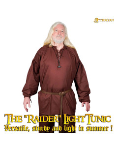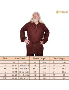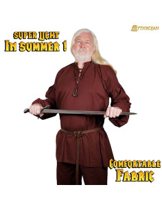 Realizzata interamente in cotone naturale, garantisce una sensazione fresca e traspirante, perfetta per mantenerti comodo durante lunghe giornate o in climi caldi. Il suo colore marrone scuro, insieme al design classico con collo rotondo con chiusura a cordoncino e maniche lunghe, evoca l'essenza dell'avventuriero medievale, ottenendo un look autentico e versatile.