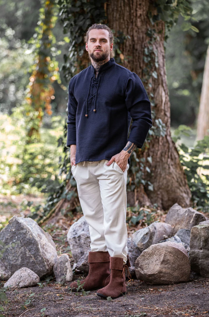 Scopri l'autentica camicia medievale spessa con lacci in nero! Questo capo unico ti riporterà al medioevo con il suo design e i suoi dettagli accuratamente intrecciati a mano. Prodotto in Germania dal rinomato marchio Leonardo Carbone, garantisce la massima qualità e durata.