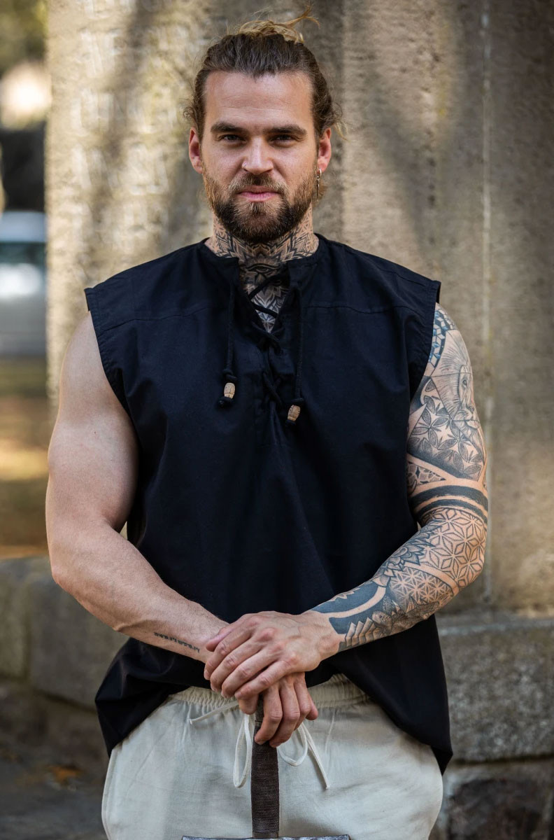 Non perdere l'occasione di sembrare un vero cavaliere medievale con la camicia nera senza maniche, modello Jean. Prendi il tuo adesso!