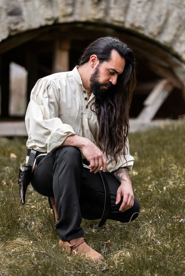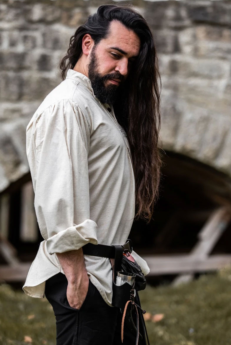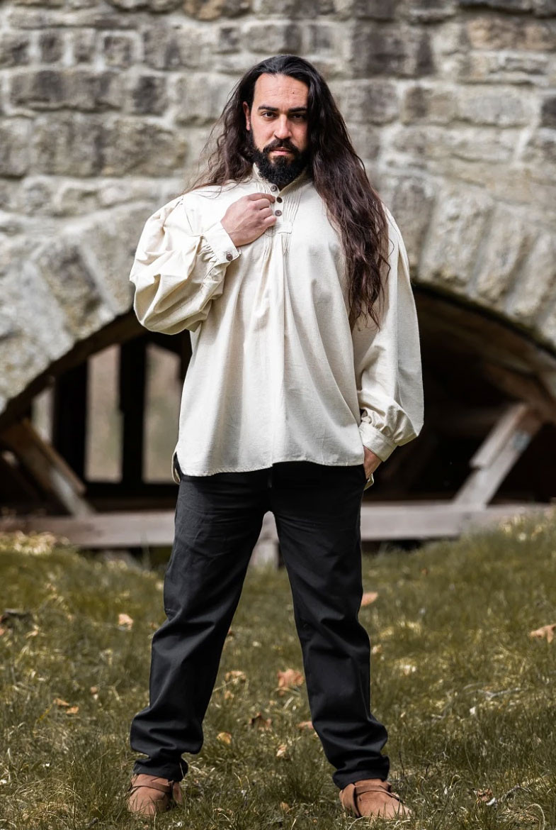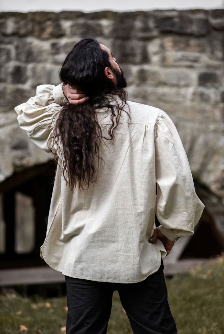 Scopri l'eleganza e lo stile della camicia medievale larga modello Oswald in bianco naturale! Questa camicia, realizzata in Germania dal rinomato marchio Leonardo Carbone, è perfetta per chi desidera un look medievale autentico e sofisticato.