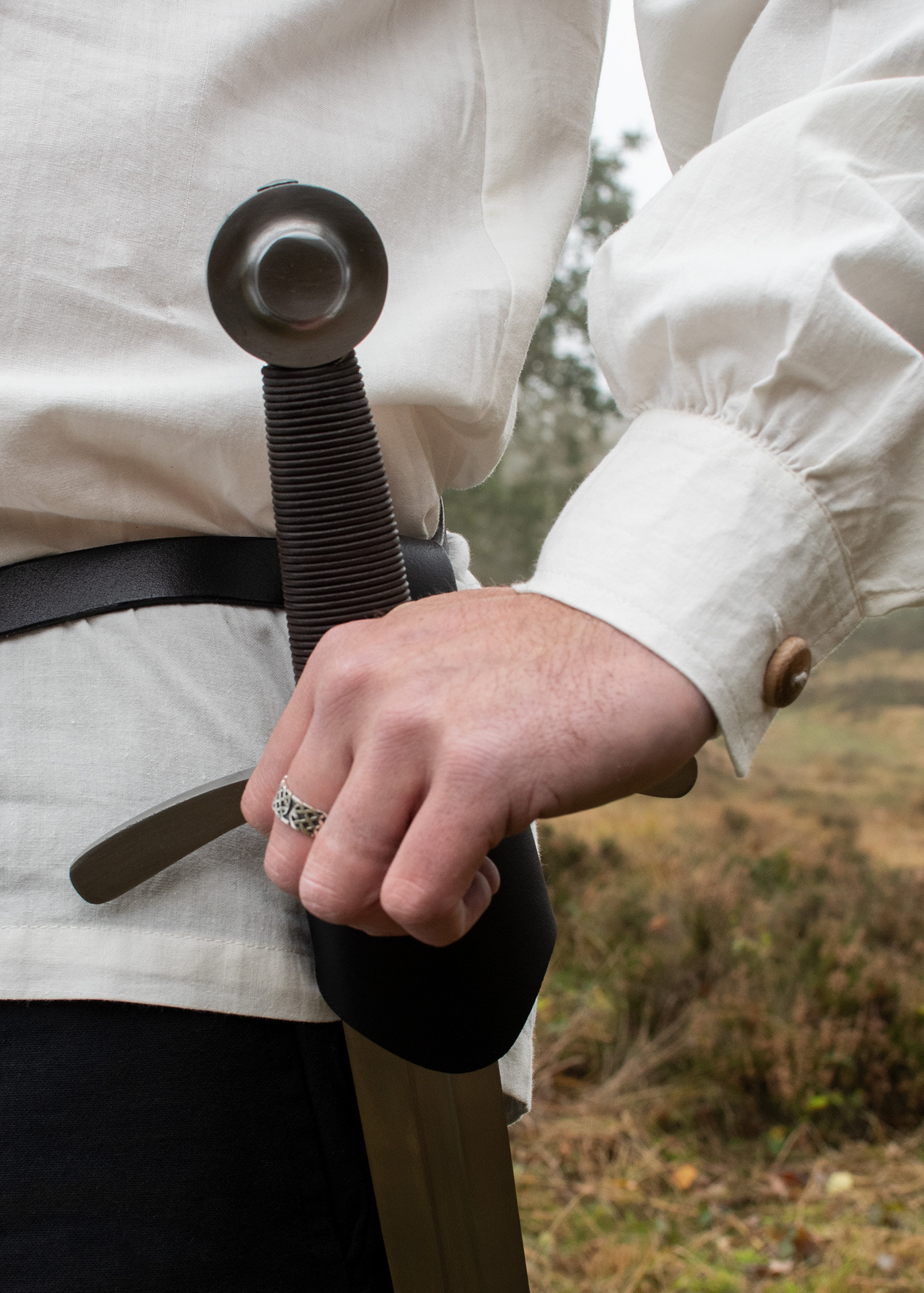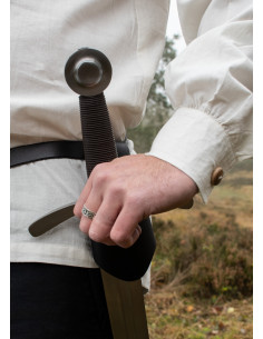 Questa camicia presenta un ampio collo e carré a doppia spalla, che le conferiscono un autentico tocco medievale. Inoltre, i bottoni in legno sullo scollo e sui polsini aggiungono un dettaglio elegante e tradizionale.