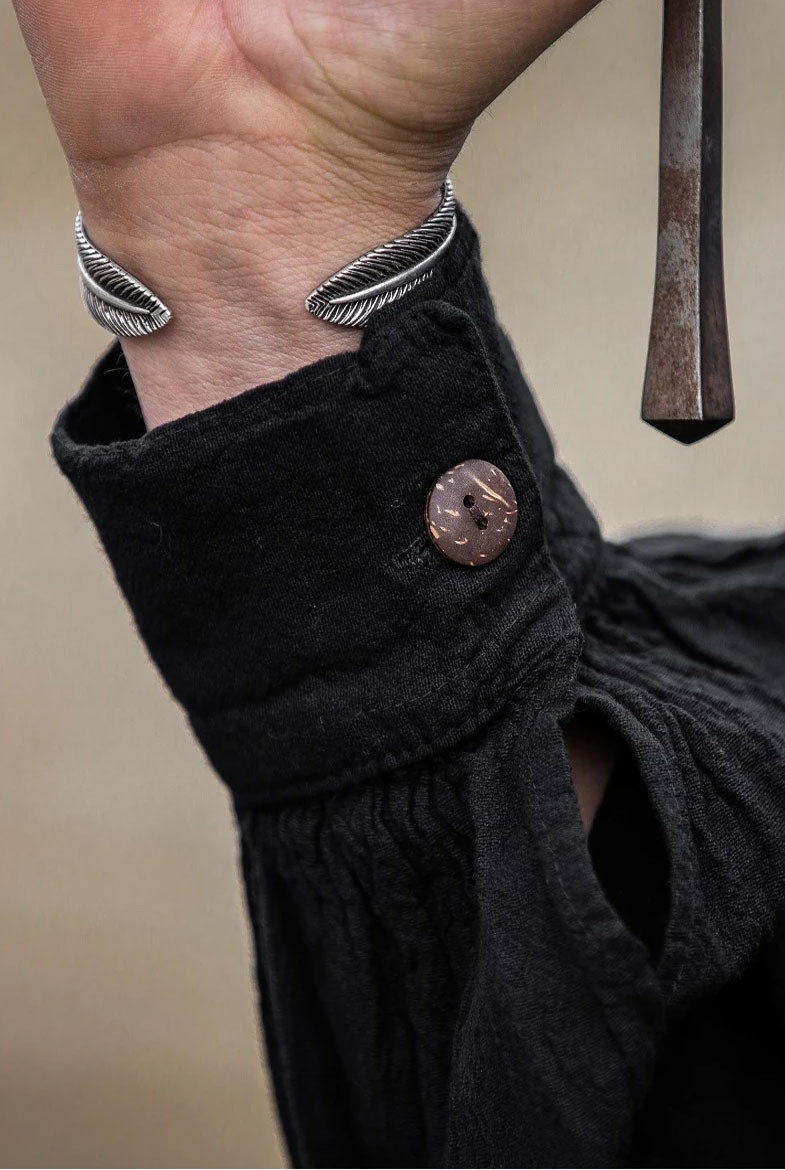 Realizzata in Germania con tessuto 100% cotone, questo capo va oltre una semplice camicia. È la tua armatura senza armatura, il tuo simbolo di resilienza e stabilità. Il colletto rialzato e le maniche larghe offrono una silhouette che conferisce status e autorità in ogni ambiente. I lacci non solo stringono, ma mostrano un carattere deciso e preparato ad affrontare ogni sfida. Se vuoi apparire come un leader che rispetta il suo patrimonio ma non teme di fare la differenza, questa camicia medievale nera con lacci sarà il tuo alleato migliore in ogni momento decisivo.