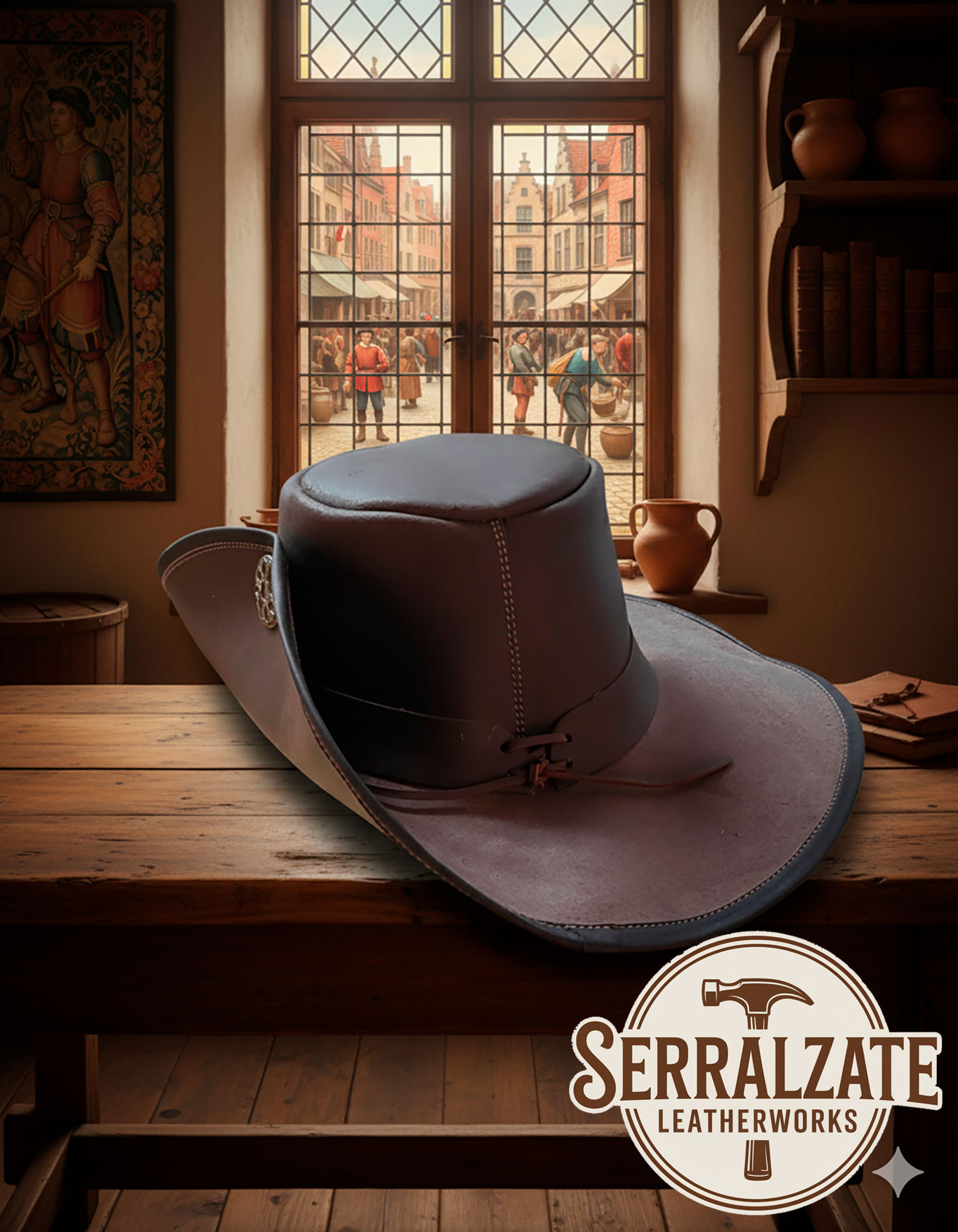 Cappello nero in pelle artigianale del XVII secolo, modello Capitano dei Tercios