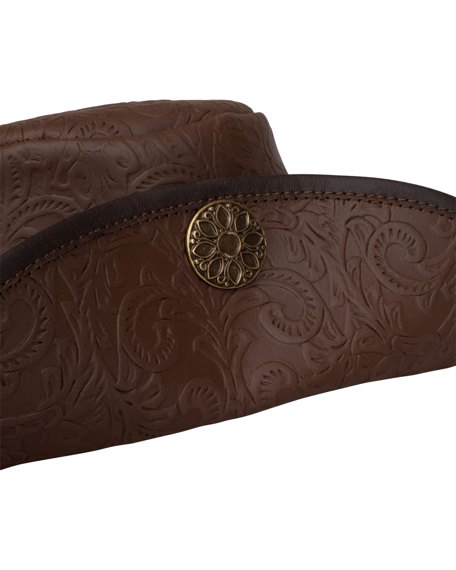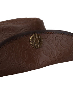 Il cappello medievale in cuoio modello Fiandre di colore marrone è un pezzo eccezionalmente lavorato, ideale per chi cerca un tocco di autenticità e stile nel proprio abbigliamento. Realizzato a mano in Spagna, questo cappello utilizza cuoio di alta qualità, garantendo sia la sua durata che una texture morbida e confortevole. Il suo design si distingue per una superficie finemente sbalzata e un'ampia tesa che conferisce carattere e protegge dal sole, completato da una moneta dall'aspetto antico che aggiunge un dettaglio di distinzione e robustezza.