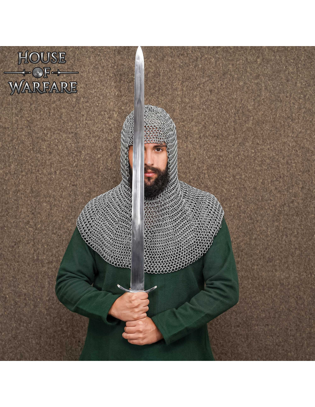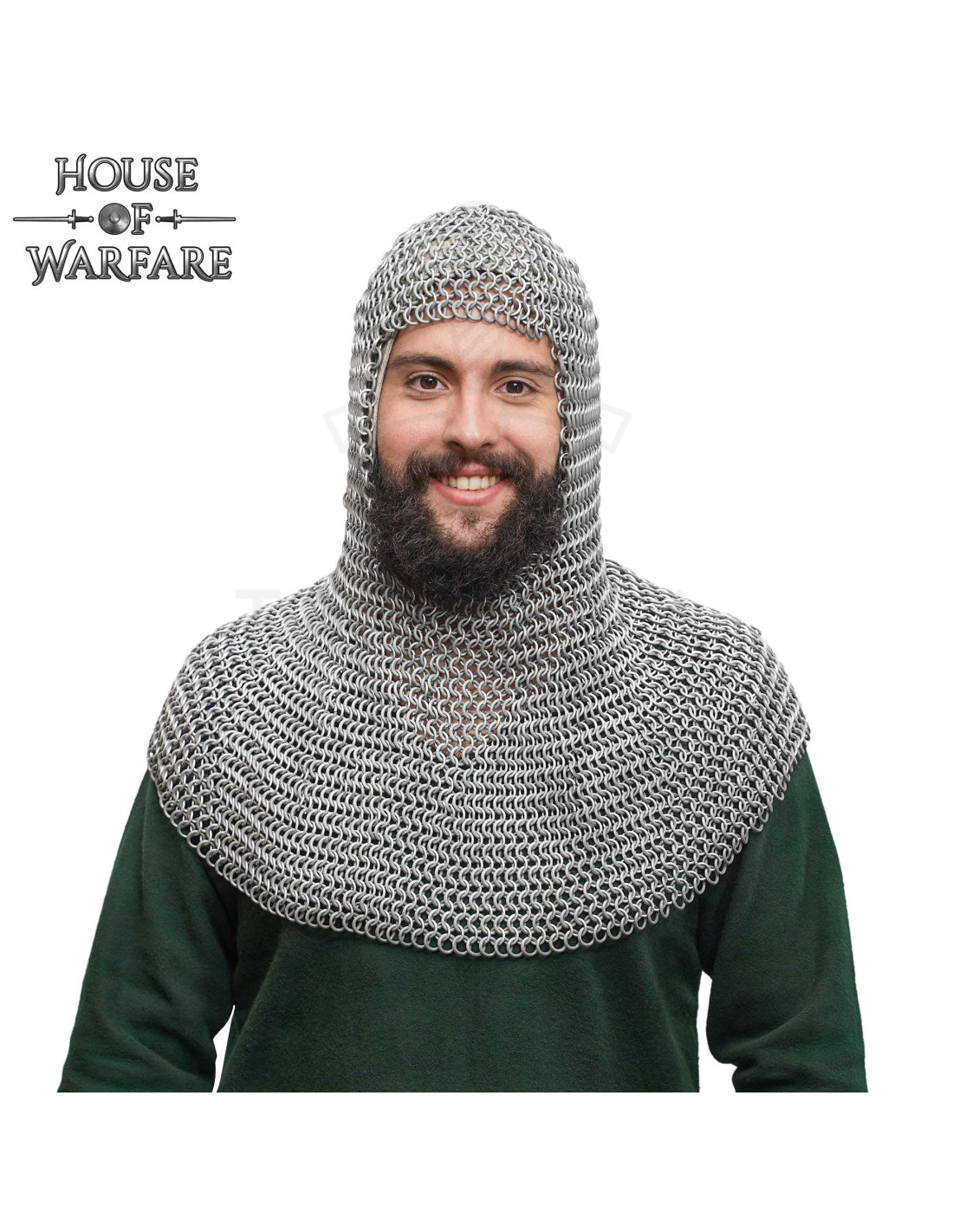 La costruzione combina un aspetto autentico con vantaggi moderni. Anelli metallici intrecciati offrono il drappeggio e la protezione attesa, mentre gli anelli di supporto in materiale flessibile introducono elasticità e comfort, permettendo al pezzo di adattarsi al contorno della testa e accompagnare i tuoi gesti. Il montaggio con anelli chiusi mantiene l'aspetto storico, facilitando allo stesso tempo l'uso continuato per eventi, allenamenti o esposizioni.