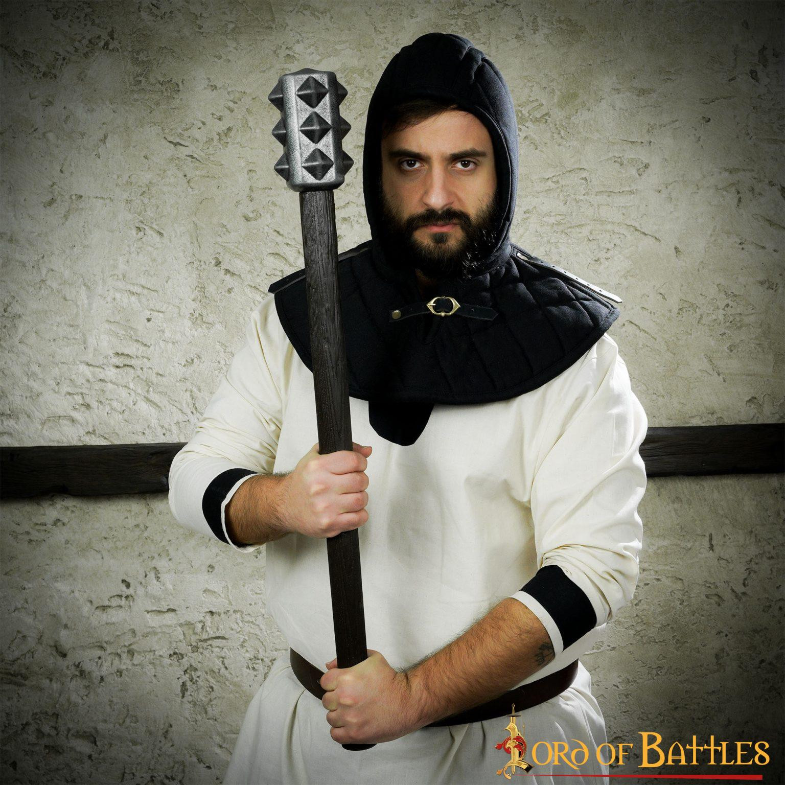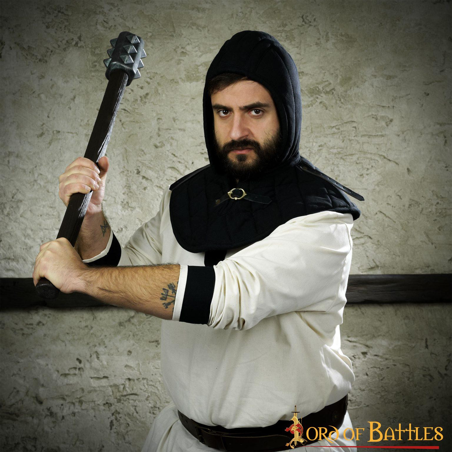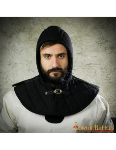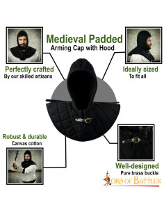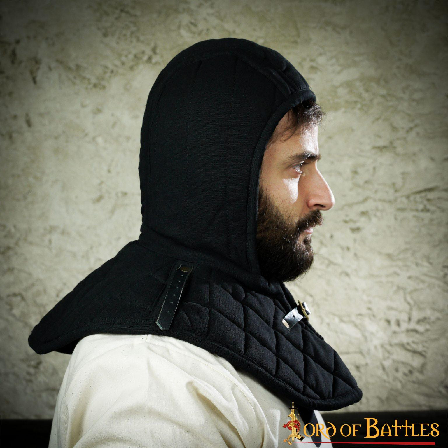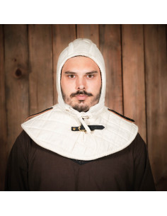 Questa crêpe medievale imbottita con gorgiera è l'accessorio perfetto che renderà molto più comodo indossare la tua armatura a piastre o cotta di maglia. Darà un ulteriore livello di protezione alla parte più sensibile del tuo corpo e in particolare alla clavicola, che è piuttosto dolorosa quando indossi un'armatura. Il cappuccio dell'armatura imbottito attaccato ti rende più comodo indossare il tuo casco preferito o il tuo copricapo in rete ancora più comodo.