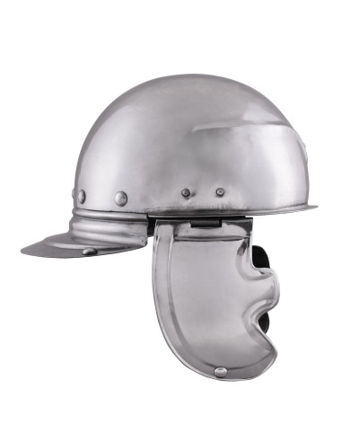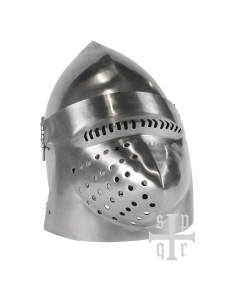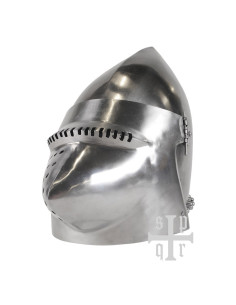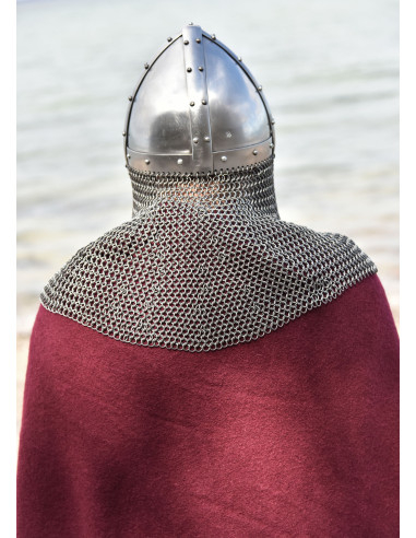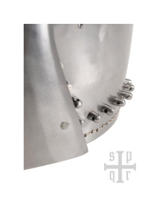Il design di questo casco include anche vervelles, piccoli rivetti sporgenti con fori, che consentono di aggiungere un boia (non incluso) per una maggiore protezione del collo. Questo dettaglio aggiuntivo non solo aggiunge autenticità storica, ma anche funzionalità.