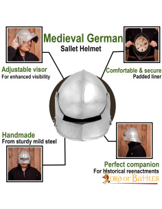 Non lesinare sulla qualità e sulle prestazioni del tuo equipaggiamento da combattimento. L'elmo medievale German Sallet con fodera imbottita, del rinomato marchio Lord of Battles, è progettato per resistere ai rigori della battaglia e offrirti la migliore protezione possibile. Il materiale utilizzato, acciaio dolce, è durevole e resistente, garantendo sempre la protezione della tua testa.