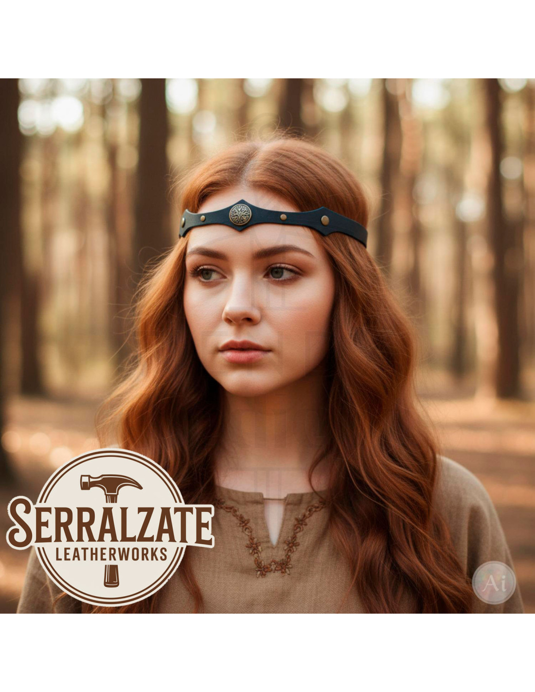 Realizzata in pelle di alta qualità, questa diadema presenta una delicata decorazione metallica dell'albero della vita, placcata in oro antico, che simboleggia crescita, rinnovamento e l'unione tra tutti gli esseri. Il suo design regolabile sul retro, tramite un cordoncino di pelle, garantisce una vestibilità comoda e adattabile a diversi stili e dimensioni della testa.