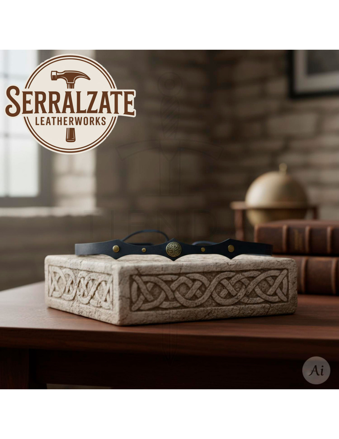 Perfetta per chi desidera aggiungere un tocco di identità celtica al proprio look quotidiano o per occasioni speciali, il suo finissaggio elegante trasforma ogni utilizzo in un'esperienza unica. La texture della pelle e il sottile splendore della decorazione metallica in oro antico offrono un contrasto sofisticato, ideale da abbinare a capi naturali o bohemien.