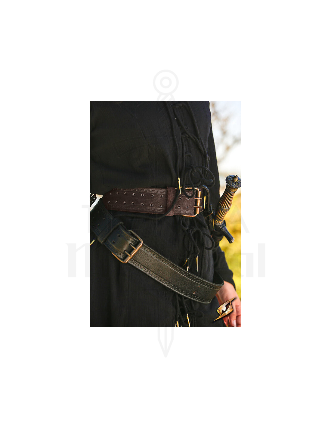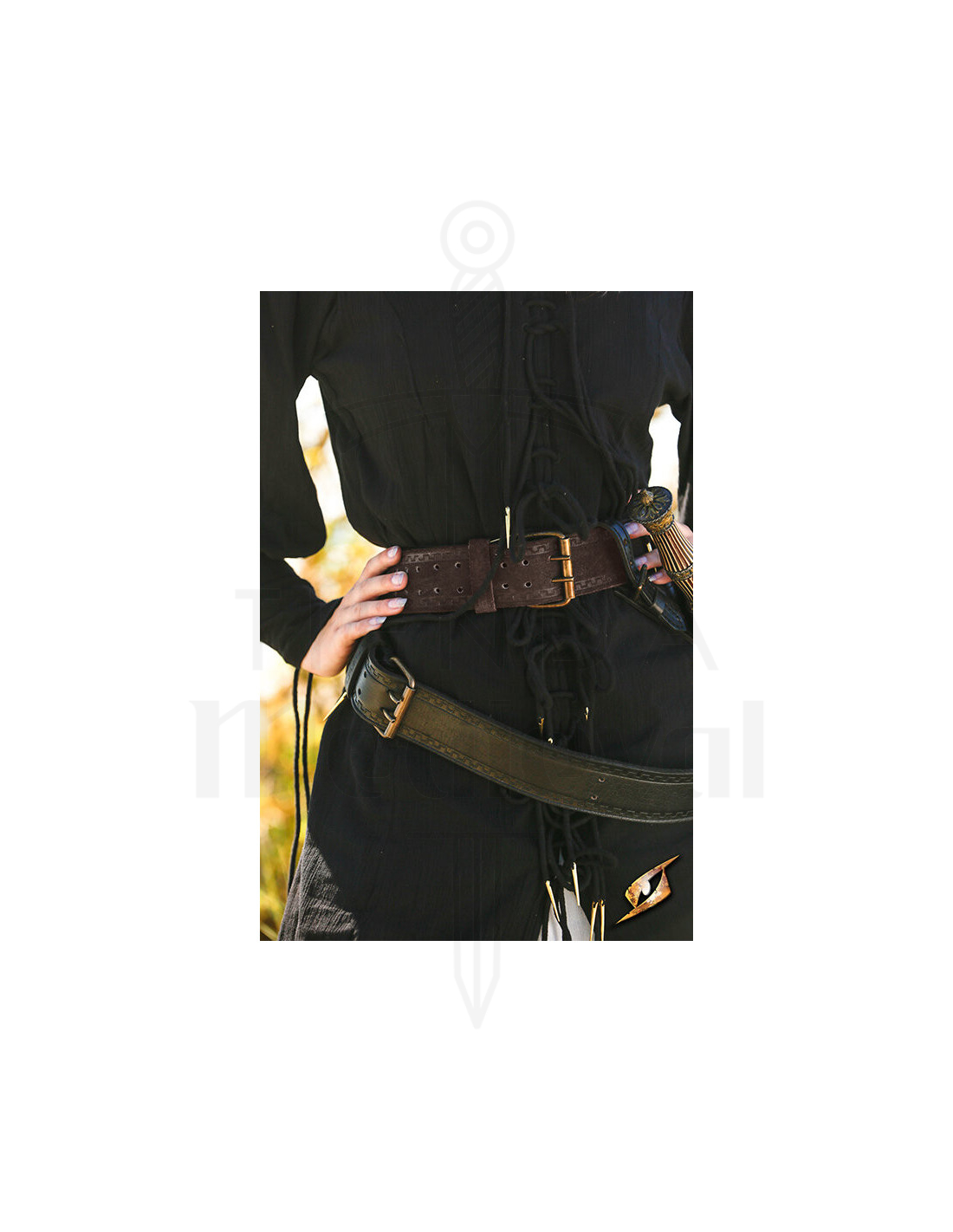 Il suo design largo e regolabile ti permette di indossarla comodamente sopra tuniche, cappotti o giacche, assicurando che i tuoi accessori, fondine o borse rimangano sempre al loro posto. La chiusura con doppia fibbia non solo garantisce maggiore sicurezza, ma anche un look dominante e deciso, ideale per completare il tuo abbigliamento storico o fantasy.