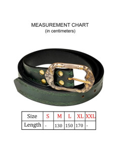Questa cintura è disponibile in tre diverse misure: 130 cm, 150 cm e 170 cm, permettendoti di trovare la misura perfetta per te. Inoltre, presenta una fibbia in ottone antico che è saldamente rivettata per garantire una chiusura visivamente accattivante e sicura.