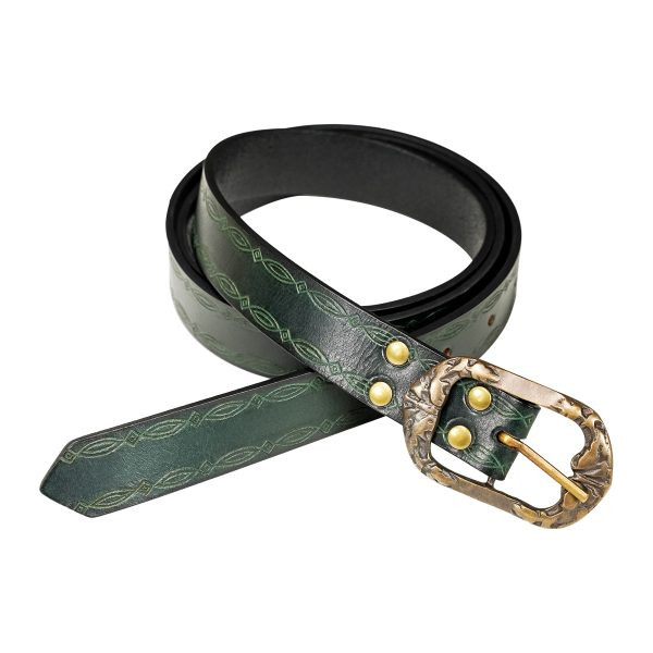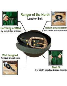 Ottieni il design Green Belt Ranger del Nord del marchio Lord of Battles! Questa cintura è stata meticolosamente realizzata a mano in vera pelle di bufalo, garantendo la sua durata e resistenza per gli anni a venire. Il suo design unico ed esclusivo ha motivi in rilievo che gli conferiscono un aspetto casual, rendendolo un accessorio essenziale per il tuo outfit moderno o per completare i tuoi costumi LARP o Cosplay.