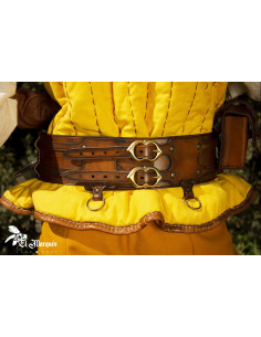 Il design ampio della cintura distribuisce il peso in modo uniforme, mentre le due fibbie metalliche, con finiture che emulano il tono del bronzo, conferiscono uno stile autentico e medievale. Inoltre, i suoi fori ti permettono di regolarla facilmente in base alla tua taglia. Per migliorare la sua praticità, è dotata di cinque anelli laterali perfetti per appendere una spada, una borsa di monete o qualsiasi altro accessorio essenziale.