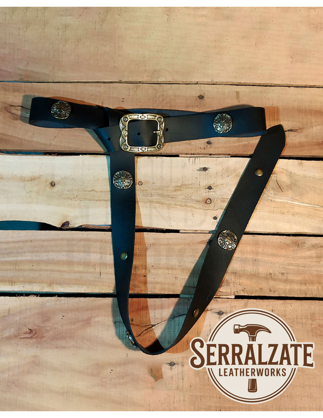 Le borchie dorate e gli applicazioni circolari con rilievi di ispirazione celtica conferiscono un'aria di nobiltà, mentre la fibbia intagliata, concepita come pezzo d'autore, funge da punto focale dell'insieme, esaltando ogni look con un tocco artigianale. Questo contrasto tra metallo e pelle ricorda pezzi forgiati con intenzione, perfetti per chi apprezza il dettaglio.